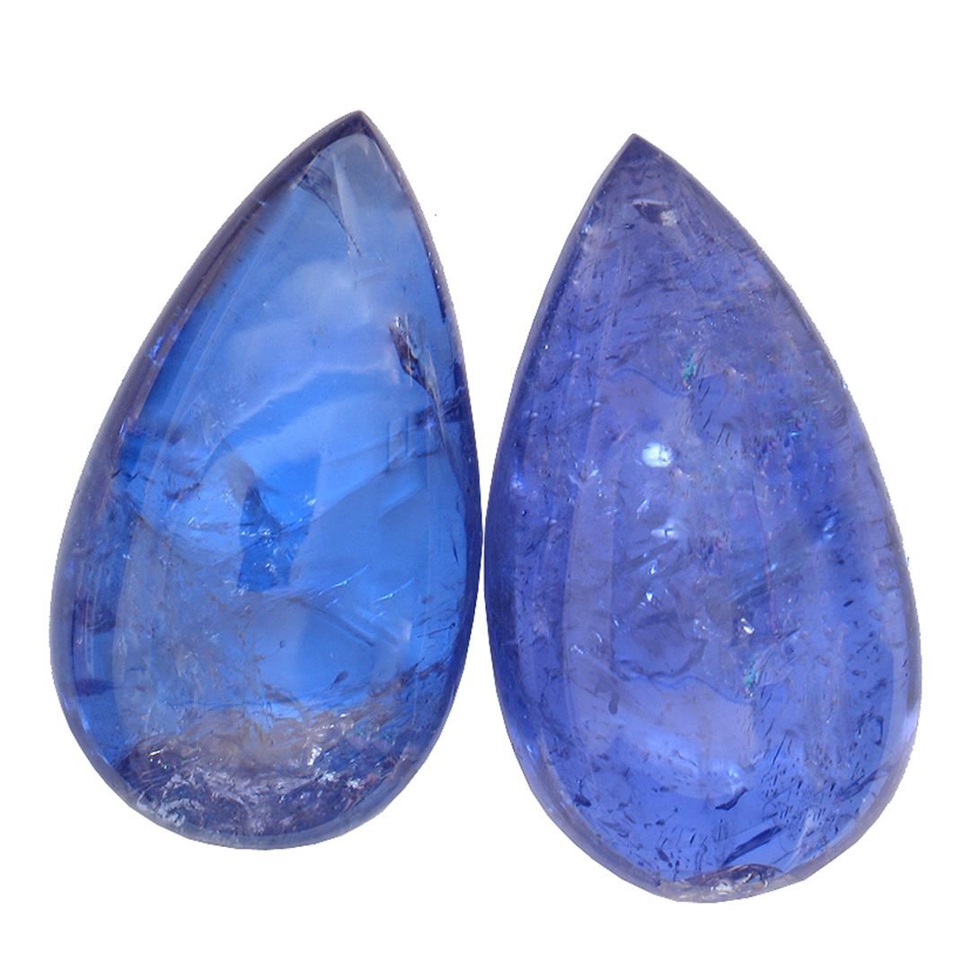 Two pear cabochon cut natural tanzanites, measuring 18.00 x 10.00 x 6.00mm, exact total weight 19.19ct., clarity is heavily included, type I, dark, moderately strong, blue color, (GIA B 7/4), cut is good. Measurements are an average for the pair. Transmitting light somewhat diffusely, transparent to translucent. Naturally occurring internal & external characteristics are present. Indications of heat treatment. Westfield Appraised at $1,840.00.