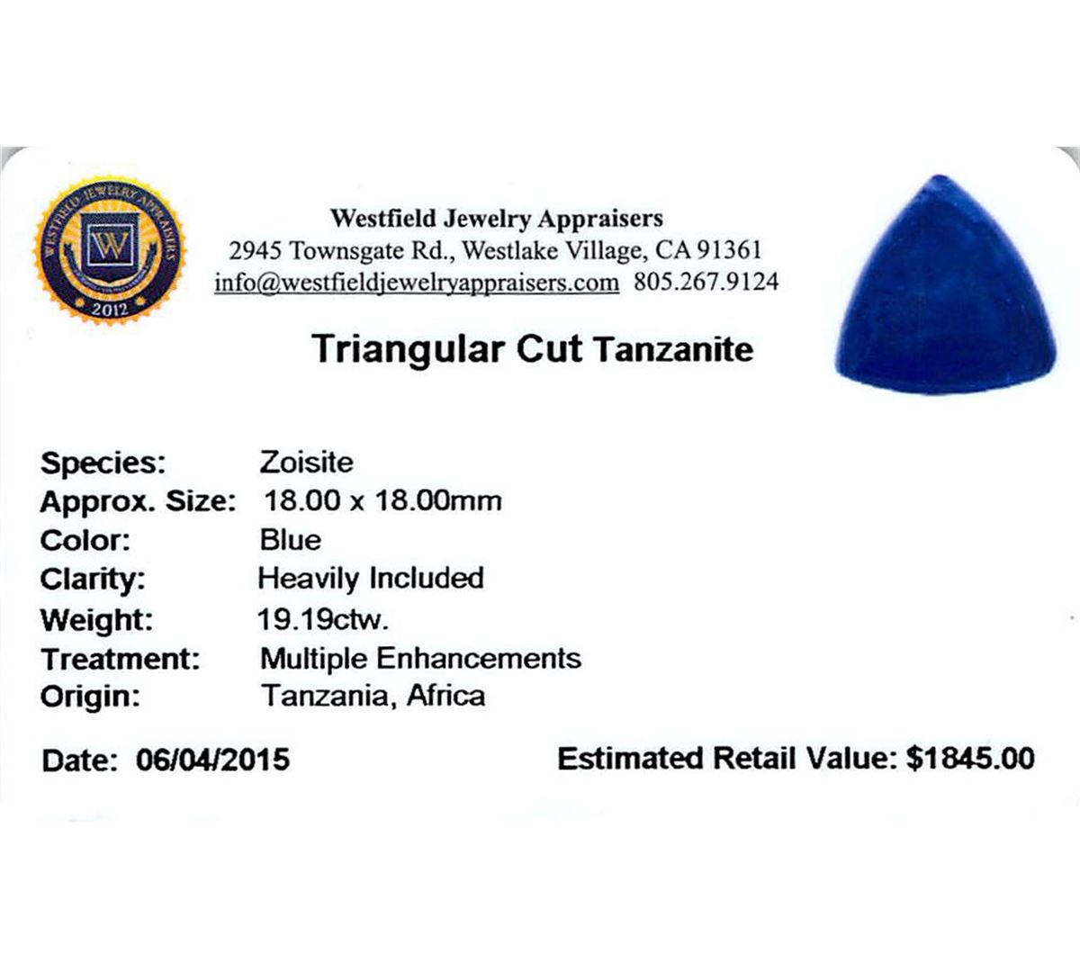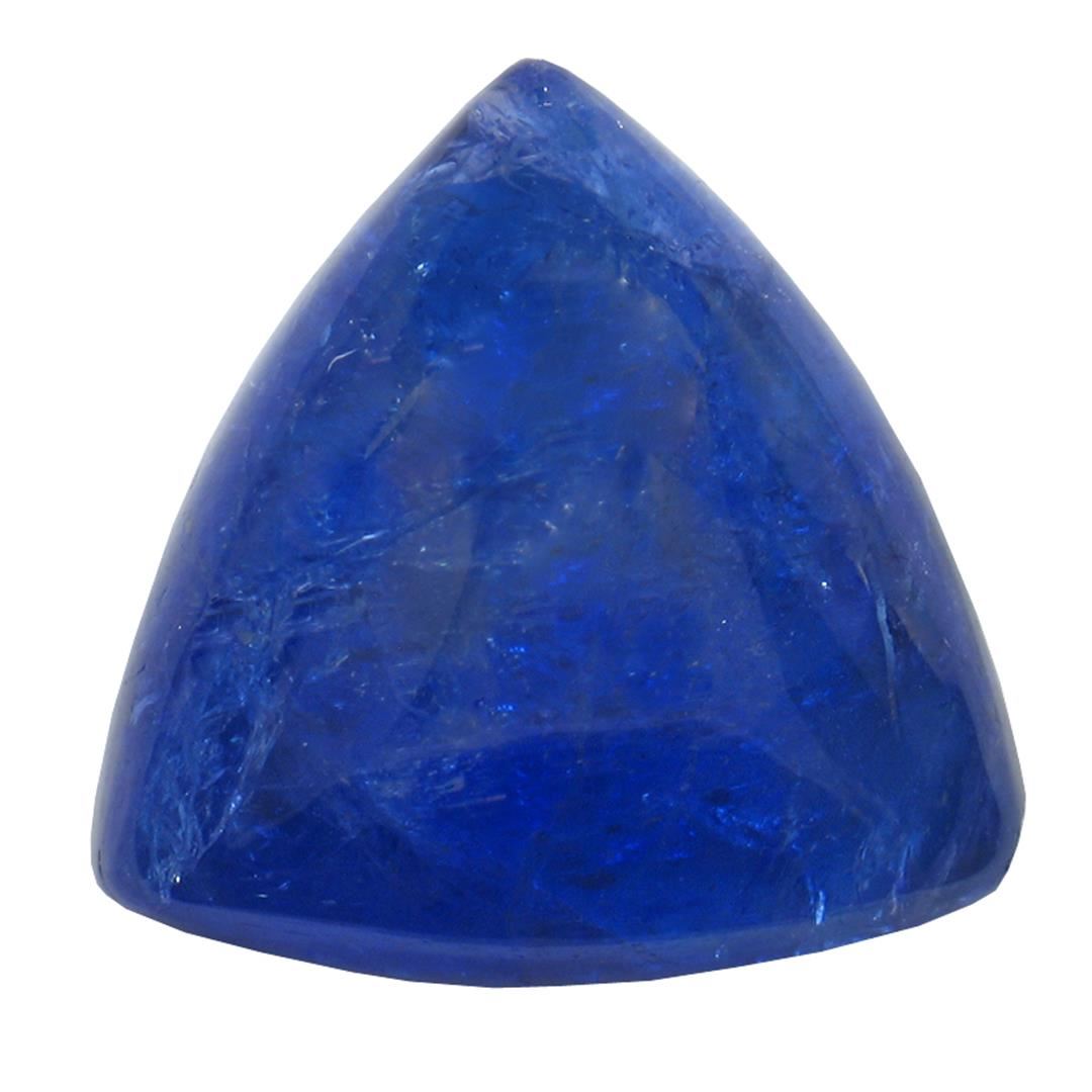 One triangle cabochon cut natural tanzanite, measuring 18.00 x 18.00 x 8.00mm, exact weight 19.19ct., clarity is heavily included, type I, dark, very slightly grayish, blue color, (GIA B 7/3), cut is good. Transmitting light somewhat diffusely, transparent to translucent. Naturally occurring internal & external characteristics are present. Indications of heat treatment. Westfield Appraised at $1,845.00.