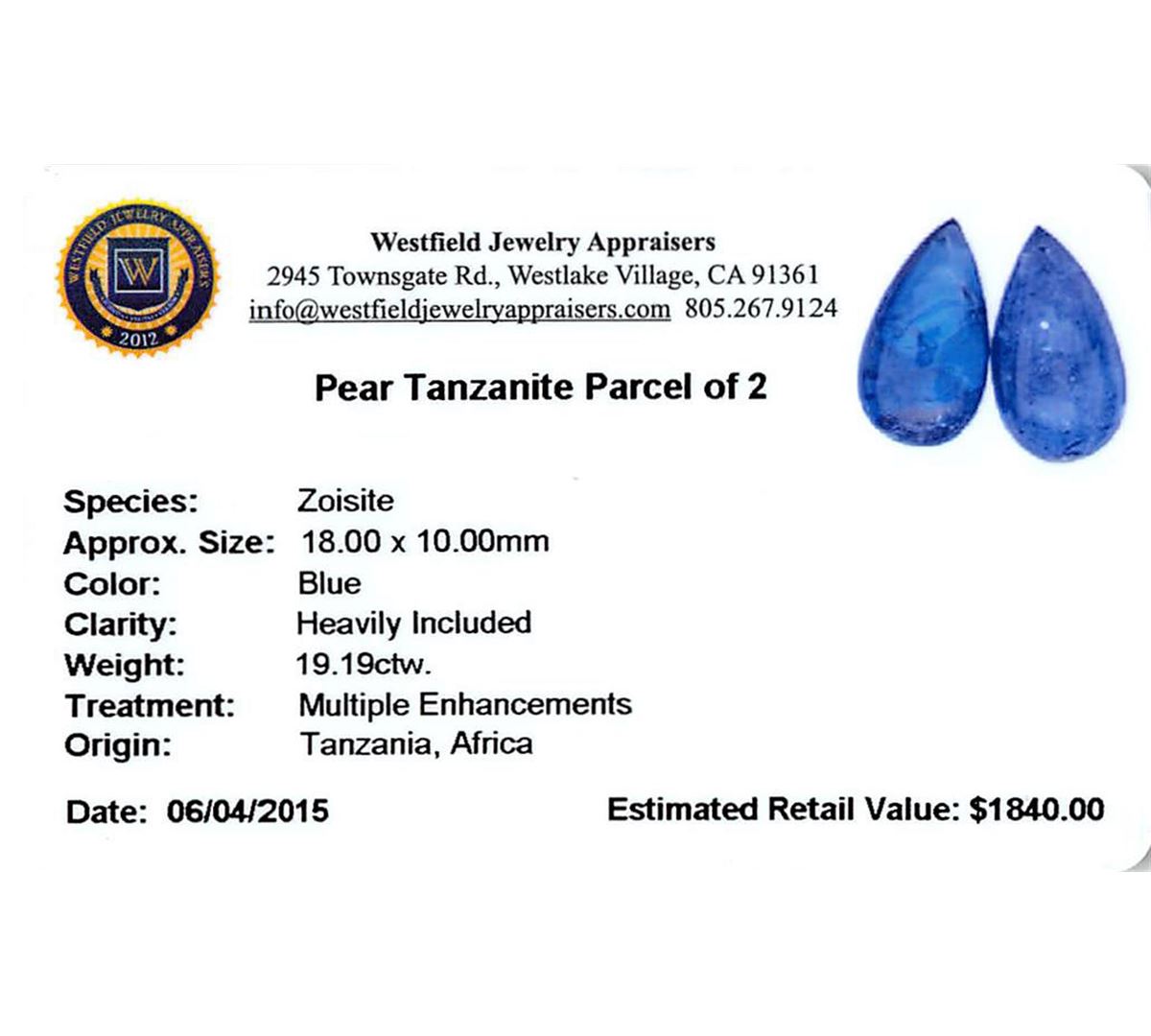 Two pear cabochon cut natural tanzanites, measuring 18.00 x 10.00 x 6.00mm, exact total weight 19.19ct., clarity is heavily included, type I, dark, moderately strong, blue color, (GIA B 7/4), cut is good. Measurements are an average for the pair. Transmitting light somewhat diffusely, transparent to translucent. Naturally occurring internal & external characteristics are present. Indications of heat treatment. Westfield Appraised at $1,840.00.