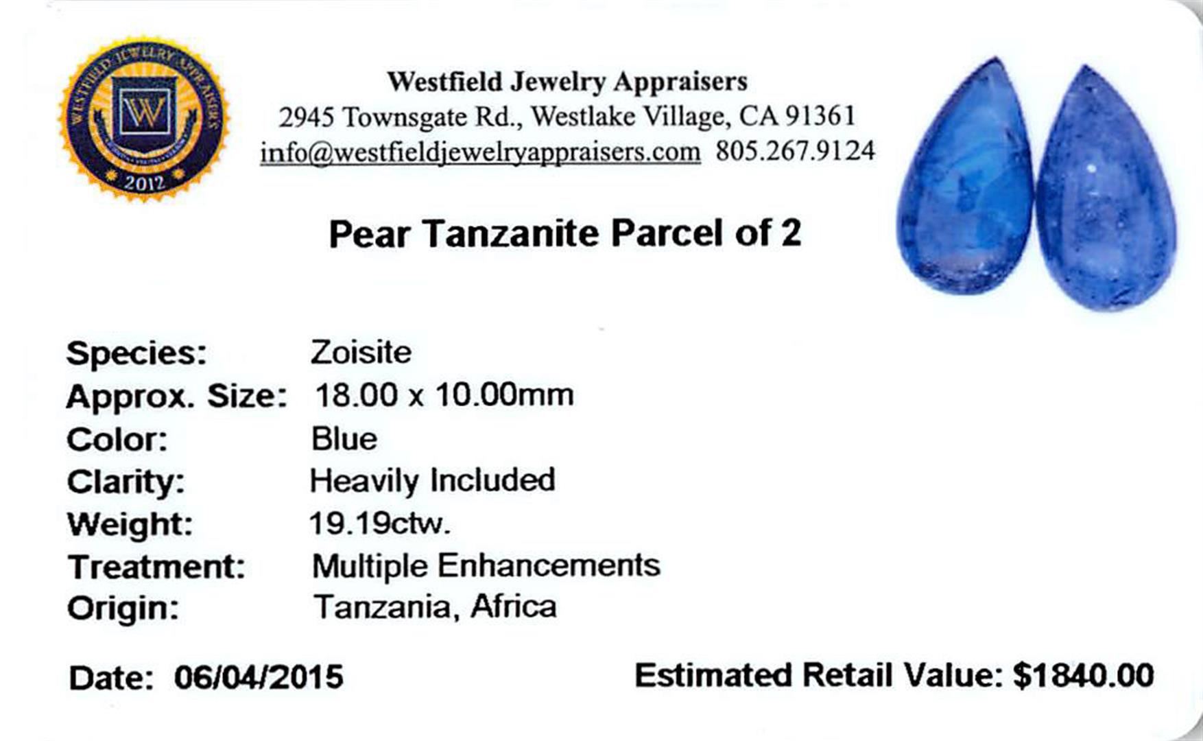 Two pear cabochon cut natural tanzanites, measuring 18.00 x 10.00 x 6.00mm, exact total weight 19.19ct., clarity is heavily included, type I, dark, moderately strong, blue color, (GIA B 7/4), cut is good. Measurements are an average for the pair. Transmitting light somewhat diffusely, transparent to translucent. Naturally occurring internal & external characteristics are present. Indications of heat treatment. Westfield Appraised at $1,840.00.
