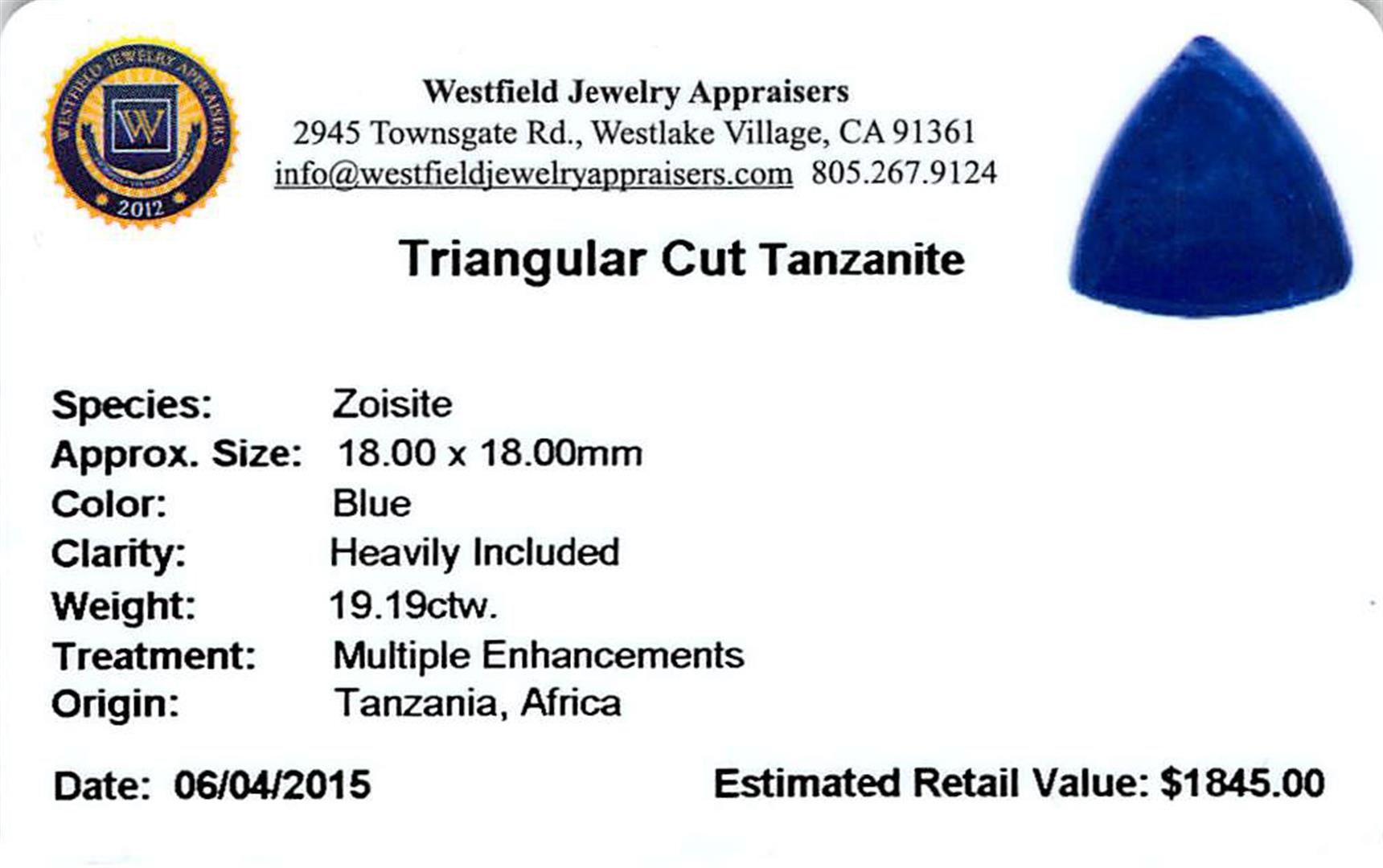 One triangle cabochon cut natural tanzanite, measuring 18.00 x 18.00 x 8.00mm, exact weight 19.19ct., clarity is heavily included, type I, dark, very slightly grayish, blue color, (GIA B 7/3), cut is good. Transmitting light somewhat diffusely, transparent to translucent. Naturally occurring internal & external characteristics are present. Indications of heat treatment. Westfield Appraised at $1,845.00.