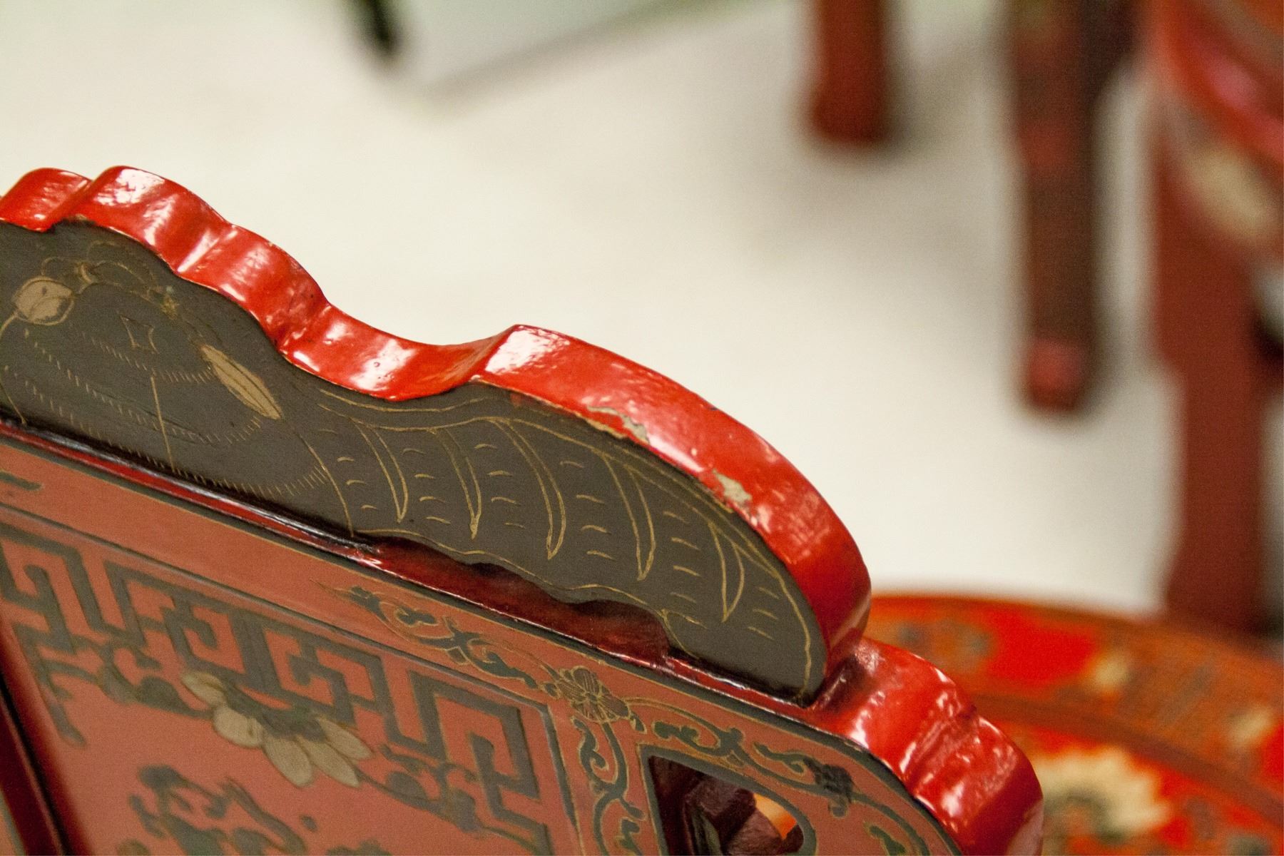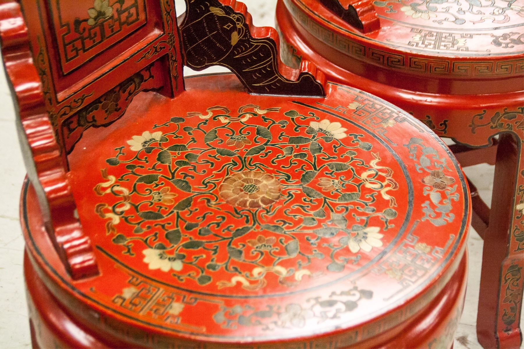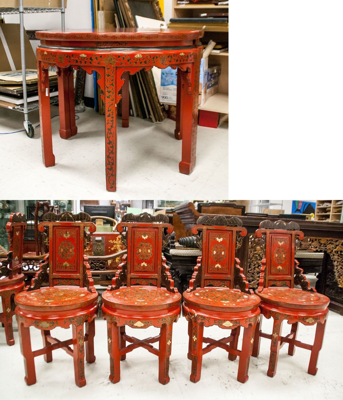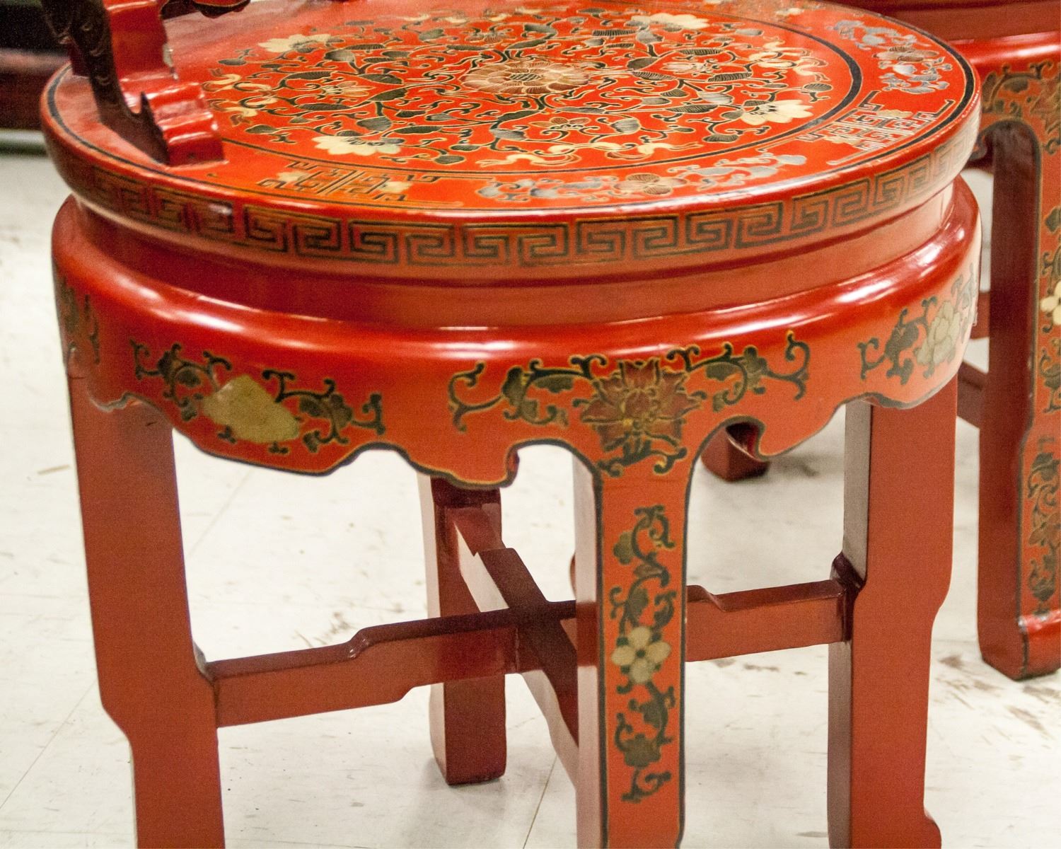 19th/20 th century Chinese red lacquer furniture set, of 1 round table, can be separated into 2 semi-sphere tables, of four round chairs with back, decorated with wood carving and painted with floral and auspicious pattern, table H: 79 cm, D: 102 cm, chair H: 89 cm, D: 44 cm