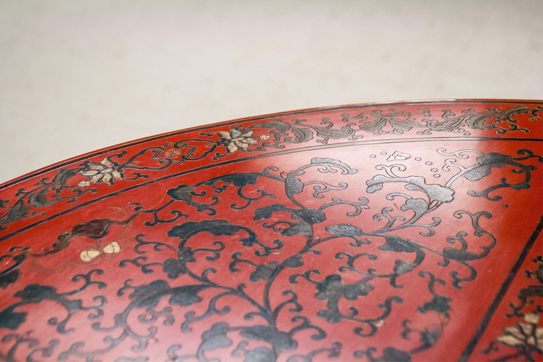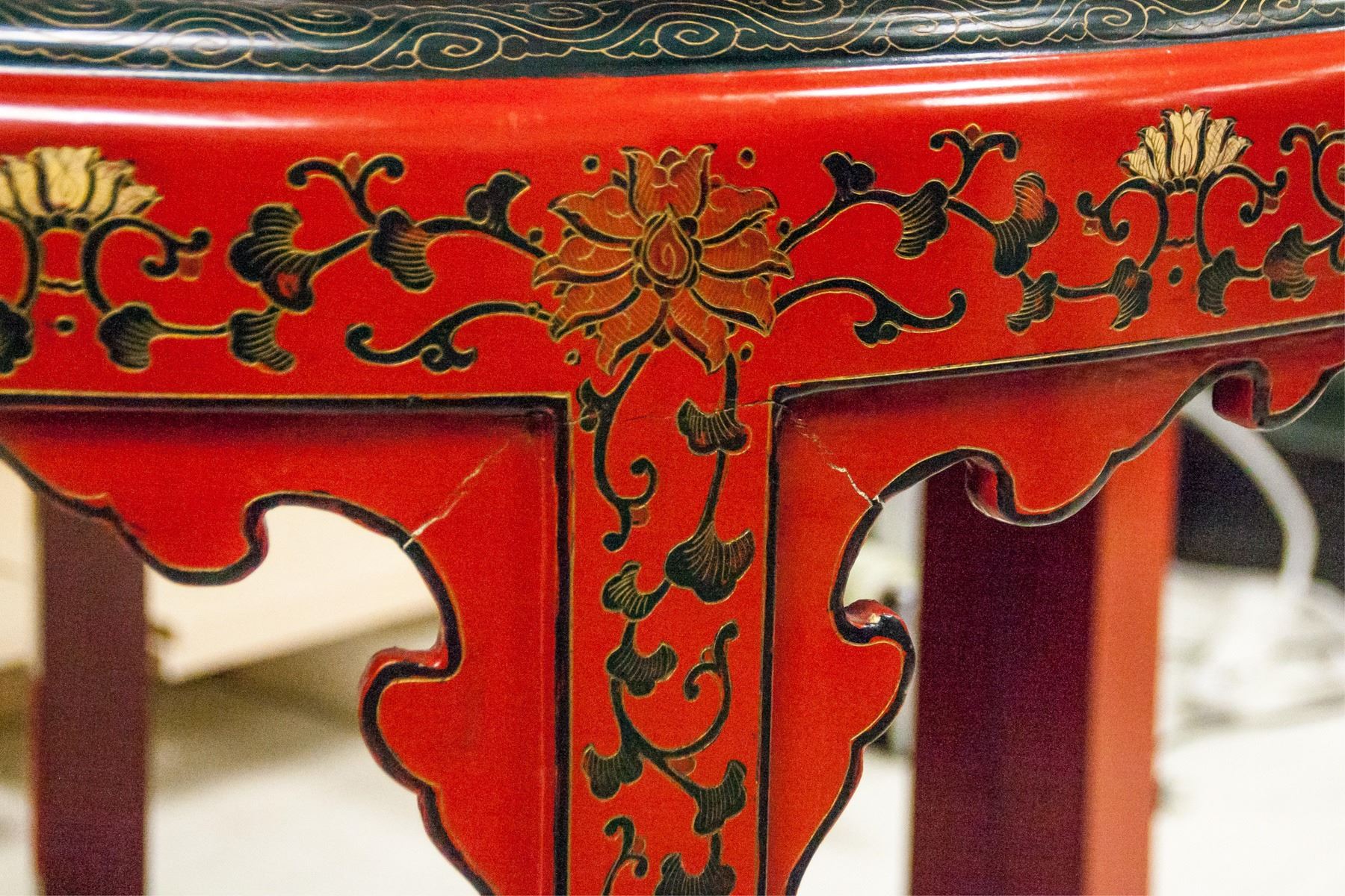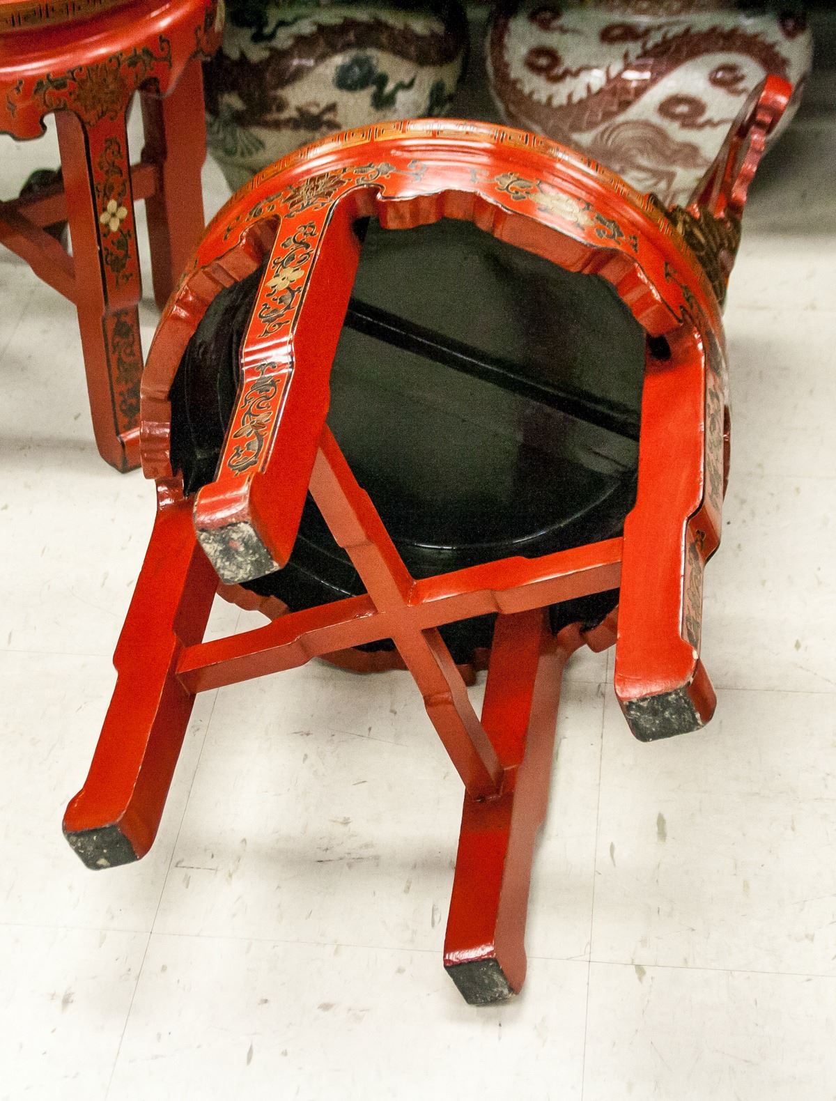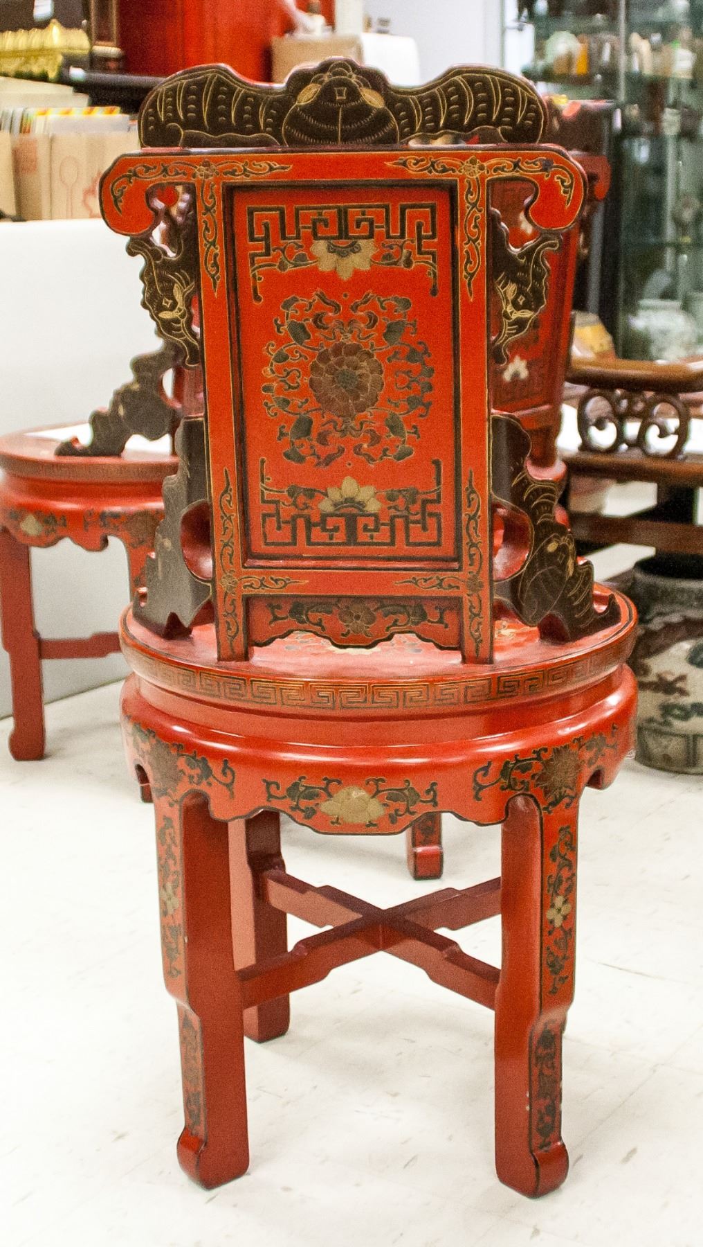 19th/20 th century Chinese red lacquer furniture set, of 1 round table, can be separated into 2 semi-sphere tables, of four round chairs with back, decorated with wood carving and painted with floral and auspicious pattern, table H: 79 cm, D: 102 cm, chair H: 89 cm, D: 44 cm