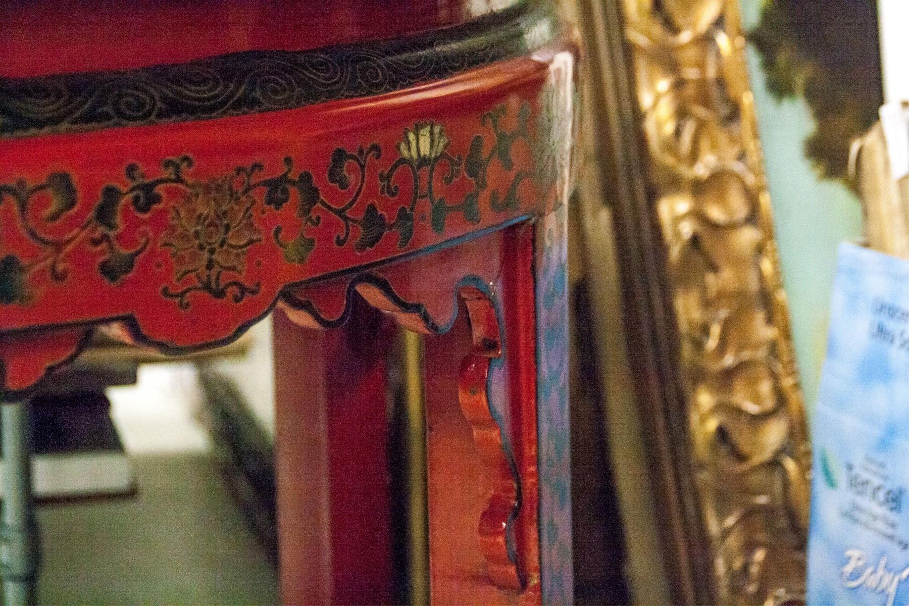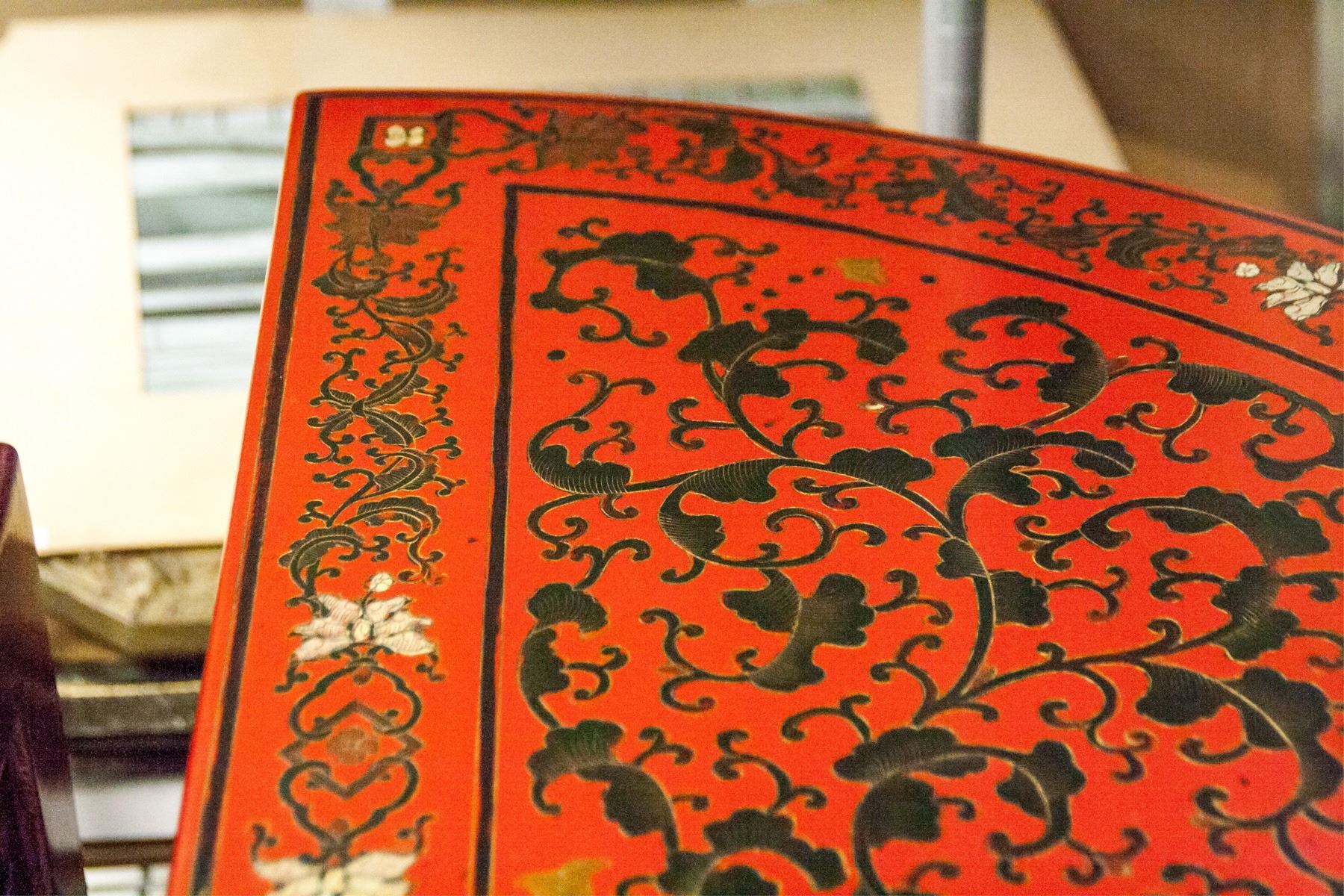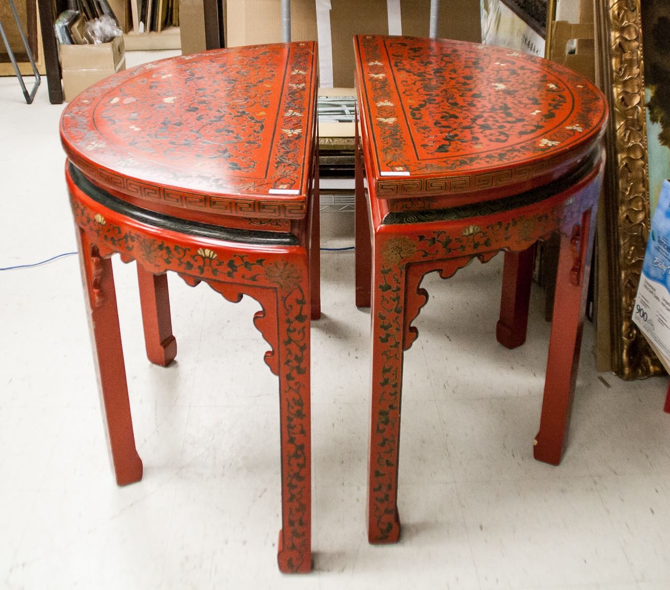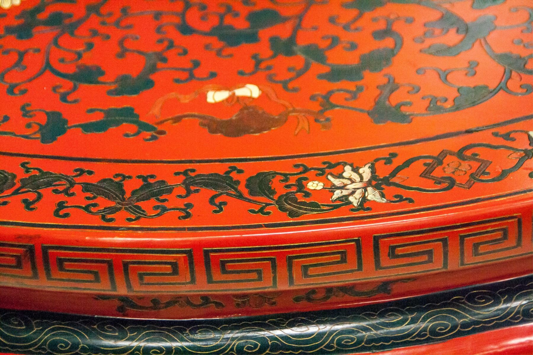 19th/20 th century Chinese red lacquer furniture set, of 1 round table, can be separated into 2 semi-sphere tables, of four round chairs with back, decorated with wood carving and painted with floral and auspicious pattern, table H: 79 cm, D: 102 cm, chair H: 89 cm, D: 44 cm