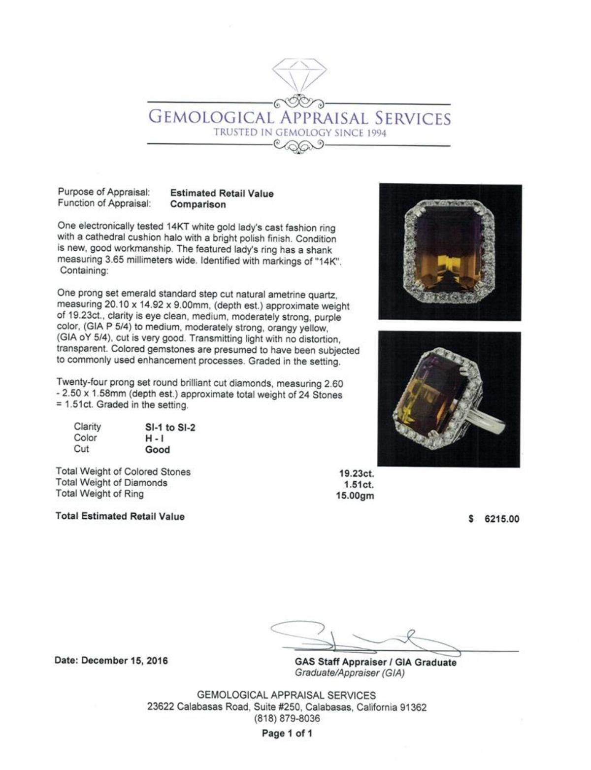 One electronically tested 14KT white gold lady's cast fashion ring with a cathedral cushion halo with a bright polish finish. The featured lady's ring has a shank measuring 3.65 millimeters wide. Identified with markings of '14K'. Condition is new, good workmanship. Containing: One prong set emerald standard step cut natural ametrine quartz, measuring 20.10 x 14.92 x 9.00mm, (depth est.) approximate weight of 19.23ct., clarity is eye clean, medium, moderately strong, purple color, (GIA P 5/4) to medium, moderately strong, orangy yellow, (GIA oY 5/4), cut is very good. Transmitting light with no distortion, transparent. Colored gemstones are presumed to have been subjected to commonly used enhancement processes. Graded in the setting. Twenty-Four prong set round brilliant cut diamonds, measuring 2.60 - 2.50 x 1.58mm (depth est.) approximate total weight of 24 Stones = 1.51ct. Graded in the setting. Clarity SI-1 to SI-2. Color: H - I Cut Good. Total Weight of Colored Stones 19.23ct.. Total Weight of Diamonds 1.51ct.. Total Weight of Ring 15.00gm. GAS Appraised.