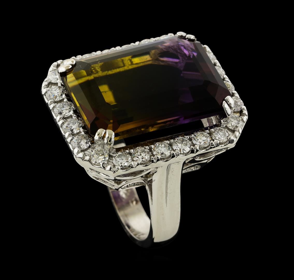 One electronically tested 14KT white gold lady's cast fashion ring with a cathedral cushion halo with a bright polish finish. The featured lady's ring has a shank measuring 3.65 millimeters wide. Identified with markings of '14K'. Condition is new, good workmanship. Containing: One prong set emerald standard step cut natural ametrine quartz, measuring 20.10 x 14.92 x 9.00mm, (depth est.) approximate weight of 19.23ct., clarity is eye clean, medium, moderately strong, purple color, (GIA P 5/4) to medium, moderately strong, orangy yellow, (GIA oY 5/4), cut is very good. Transmitting light with no distortion, transparent. Colored gemstones are presumed to have been subjected to commonly used enhancement processes. Graded in the setting. Twenty-Four prong set round brilliant cut diamonds, measuring 2.60 - 2.50 x 1.58mm (depth est.) approximate total weight of 24 Stones = 1.51ct. Graded in the setting. Clarity SI-1 to SI-2. Color: H - I Cut Good. Total Weight of Colored Stones 19.23ct.. Total Weight of Diamonds 1.51ct.. Total Weight of Ring 15.00gm. GAS Appraised.