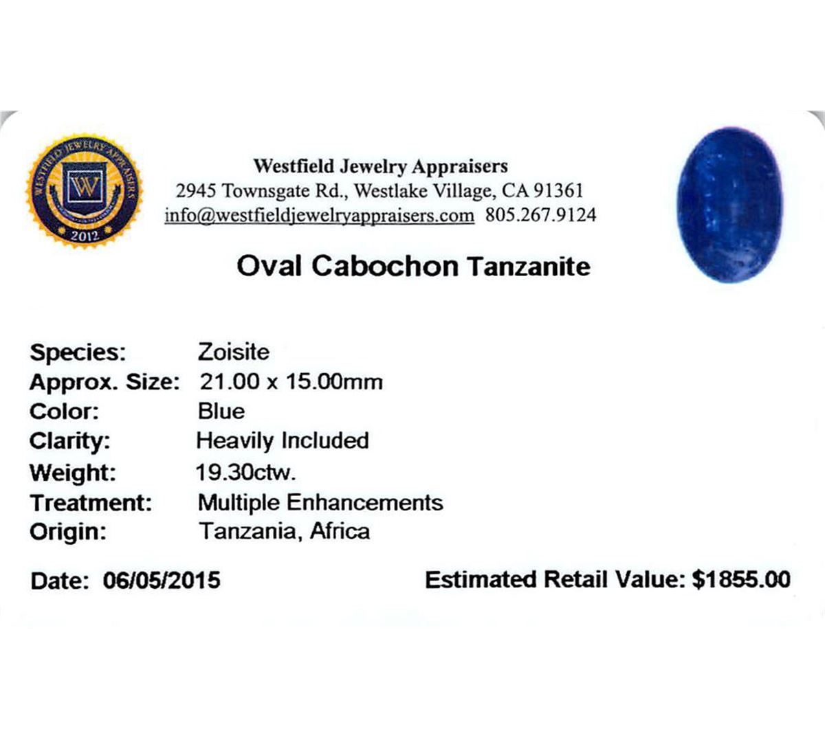 One oval cabochon cut natural tanzanite, measuring 21.00 x 15.00 x 7.00mm, exact weight 19.30ct., clarity is heavily included, type I, dark, very slightly grayish, blue color, (GIA B 7/3), cut is good. Transmitting light somewhat diffusely, transparent to translucent. Naturally occurring internal & external characteristics are present. Indications of heat treatment. Westfield Appraised at $1,855.00.