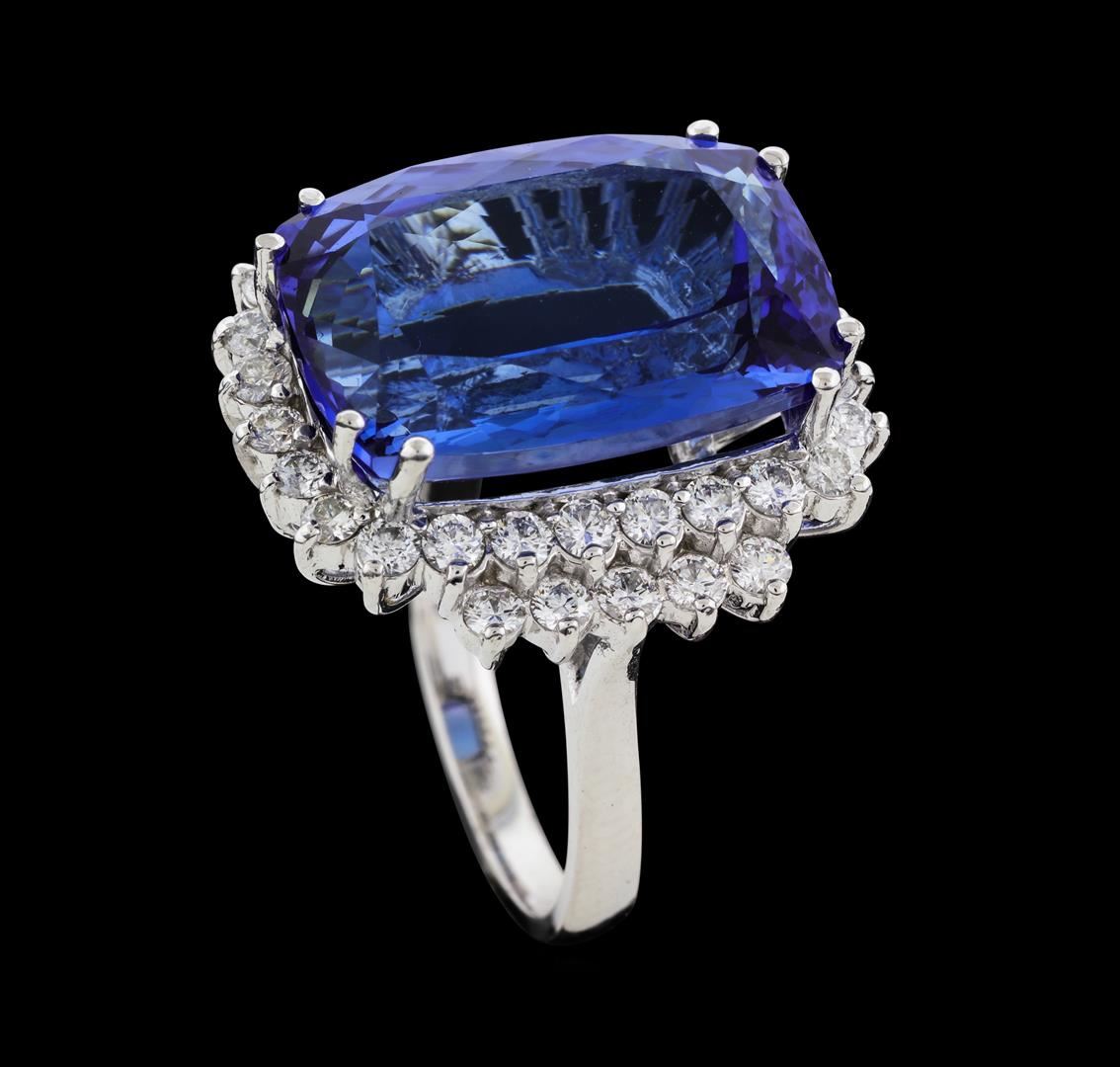 One electronically tested 14KT white gold lady's cast fashion ring with a cathedral shank with a basket halo with a bright polish finish. The featured lady's ring has a shank measuring 2.39 millimeters wide. Identified with markings of 'K14'. Condition is new, good workmanship. Containing: One prong set rectangular cushion modified brilliant cut natural tanzanite, measuring 18.54 x 13.60 x 8.35mm, (depth est.) 17%. bulge factor, approximate weight of 19.30ct., clarity is eye clean, medium, very slightly grayish, blue color, (GIA B 5/3), cut is very good. Transmitting light with no distortion, transparent. Colored gemstones are presumed to have been subjected to commonly used enhancement processes. Graded in the setting. Thirty-Six prong set round brilliant cut diamonds, measuring 2.20 - 2.10 x 1.33mm (depth est.) approximate total weight of 36 Stones = 1.35ct. Graded in the setting. Clarity SI-1 to I-1. Color: G - H Cut Good. Total Weight of Colored Stones 19.30ct.. Total Weight of Diamonds 1.35ct.. Total Weight of Ring 11.20gm. GAS Appraised at $24,730.00.