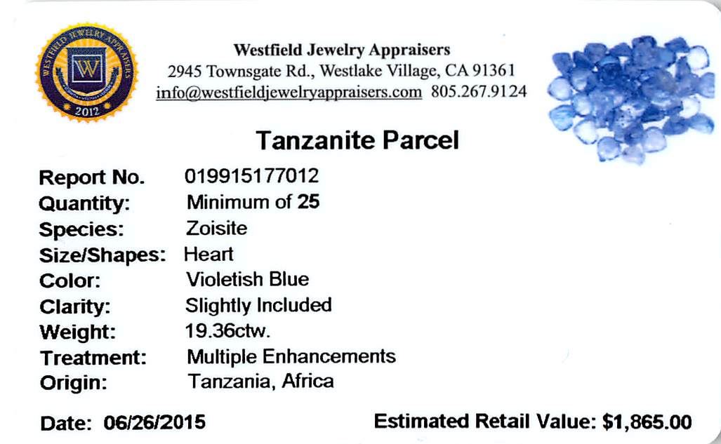 Twenty-five heart mixed cut natural tanzanites, measuring 5.00 x 5.00 x 3.25mm, exact total weight 19.36ct., clarity is slightly included, type I, medium dark, very slightly grayish, violetish blue color, (GIA vB 6/3), cut is good. Measurements & the Westfield Appraised at $1,865.00.