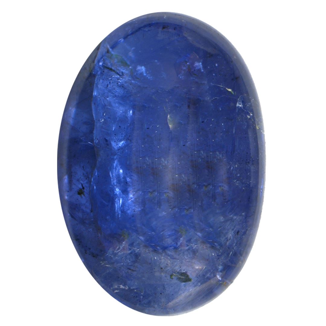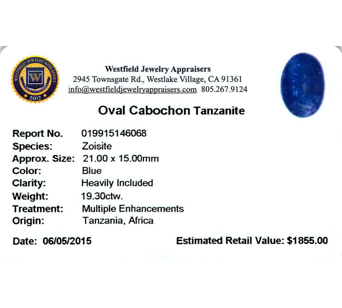 One oval cabochon cut natural tanzanite, measuring 21.00 x 15.00 x 7.00mm, exact weight 19.30ct., clarity is heavily included, type I, dark, very slightly grayish, blue color, (GIA B 7/3), cut is good. Transmitting light somewhat diffusely, transparent to translucent. Naturally occurring internal & external characteristics are present. Indications of heat treatment. Westfield Appraised at $1,855.00.