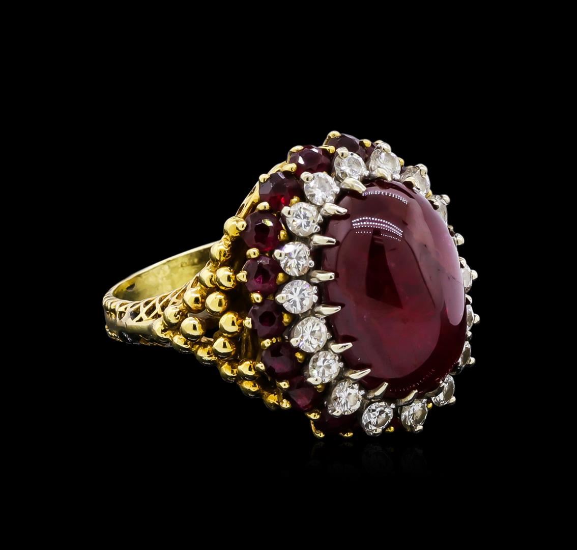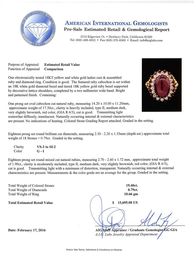 One electronically tested 18KT yellow and white gold ladies cast & assembled ruby and diamond ring. The featured ruby cabochon is set within an 18K white gold diamond bezel and tiered 18K yellow gold ruby bezel supported by decorative lattice shoulders, completed by a two millimeter wide band. Bright and patterned finish. Condition is good. Containing: One prong set oval cabochon cut natural ruby, measuring 14.20 x 10.00 x 11.20mm, approximate weight of 17.50ct., clarity is heavily included, type II, medium dark, very slightly brownish, red color, (GIA R 6/3), cut is good. Transmitting light somewhat diffusely, translucent. Naturally occurring internal & external characteristics are present. No indications of heating. Colored Stone Grading Report attached. Graded in the setting. Eighteen prong set round brilliant cut diamonds, measuring 2.30 - 2.20 x 1.35mm (depth est.) approximate total weight of 18 Stones = 0.79ct. Graded in the setting. Clarity: VS-2 to SI-2. Color: G - I Eighteen prong set round mixed cut natural rubies, measuring 2.70 - 2.60 x 1.72 mm, approximate total weight of 1.90ct., clarity is moderately included, type II, medium dark, very slightly brownish, red color, (GIA R 6/3), cut is good. Transmitting light with a minimum of distortion, transparent. Naturally occurring internal & external characteristics are present. Measurements & the color grade are an average for the group. Graded in the setting. Total Weight of Colored Stones 19.40ct. Total Weight of Diamonds 0.79ct. Total Weight of Ring 10.66gm. AIG Appraised at $15,695.00.