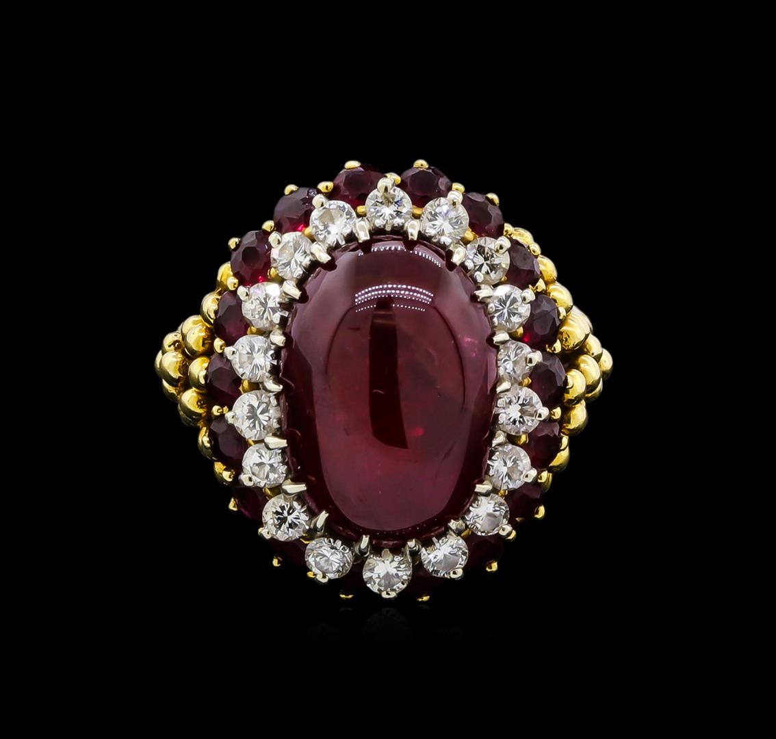 One electronically tested 18KT yellow and white gold ladies cast & assembled ruby and diamond ring. The featured ruby cabochon is set within an 18K white gold diamond bezel and tiered 18K yellow gold ruby bezel supported by decorative lattice shoulders, completed by a two millimeter wide band. Bright and patterned finish. Condition is good. Containing: One prong set oval cabochon cut natural ruby, measuring 14.20 x 10.00 x 11.20mm, approximate weight of 17.50ct., clarity is heavily included, type II, medium dark, very slightly brownish, red color, (GIA R 6/3), cut is good. Transmitting light somewhat diffusely, translucent. Naturally occurring internal & external characteristics are present. No indications of heating. Colored Stone Grading Report attached. Graded in the setting. Eighteen prong set round brilliant cut diamonds, measuring 2.30 - 2.20 x 1.35mm (depth est.) approximate total weight of 18 Stones = 0.79ct. Graded in the setting. Clarity: VS-2 to SI-2. Color: G - I Eighteen prong set round mixed cut natural rubies, measuring 2.70 - 2.60 x 1.72 mm, approximate total weight of 1.90ct., clarity is moderately included, type II, medium dark, very slightly brownish, red color, (GIA R 6/3), cut is good. Transmitting light with a minimum of distortion, transparent. Naturally occurring internal & external characteristics are present. Measurements & the color grade are an average for the group. Graded in the setting. Total Weight of Colored Stones 19.40ct. Total Weight of Diamonds 0.79ct. Total Weight of Ring 10.66gm. AIG Appraised at $15,695.00.