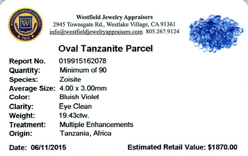 Ninety oval mixed cut natural tanzanites, measuring 4.00 x 3.00 x 1.95mm, approximate total weight of 19.43ct., clarity is eye clean, type I, medium dark, very slightly grayish, bluish violet color, (GIA bV 6/3), cut is good. Transmitting light with no distortion, transparent. Color grade is an average for the group. Graded in the setting. Tanzanite is a very rare gemstone that is only found in the country of Tanzania. Originally discovered in 1967. Tiffany & Company, named the stone Tanzanite. It is found in the Usumburu Mountains that border the Umba Valley of northern Tanzania. Tanzanite occurs in gray, brown, violet, blue, reddish-purple, & green. The gem is interesting because of its exceptional pleochroism. Rotated in different directions a tanzanite will exhibit multiple changes of color. Tanzanite has a low tolerance to ultrasonic cleaning, and should not be cleaned using this method. Westfield Appraised at $1,870.00.