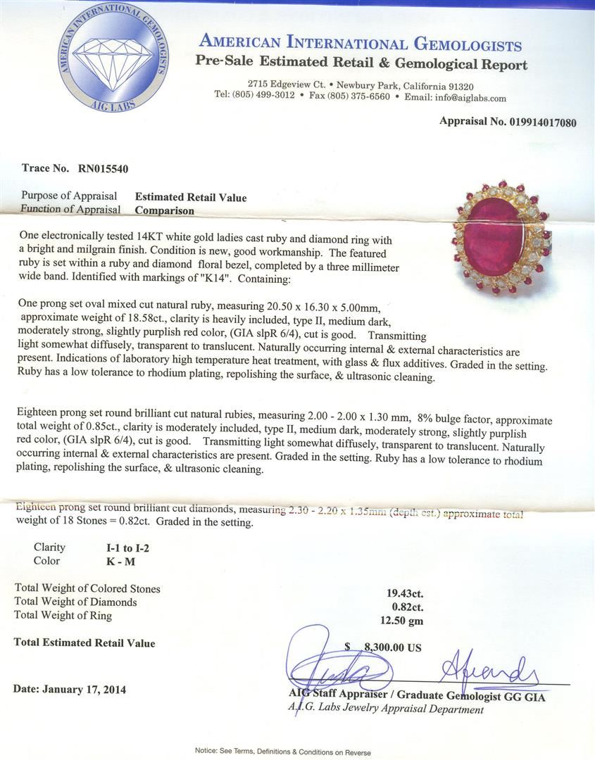 One electronically tested 14KT white gold ladies cast ruby and diamond ring with a bright and milgrain finish. The featured ruby is set within a ruby and diamond floral bezel, completed by a three millimeter wide band. Identified with markings of "K14". Condition is new, good workmanship. Containing: One prong set oval mixed cut natural ruby, measuring 20.50 x 16.30 x 5.00mm, approximate weight of 18.58ct., clarity is heavily included, type II, medium dark, moderately strong, slightly purplish red color, (GIA slpR 6/4), cut is good. Transmitting light somewhat diffusely, transparent to translucent. Naturally occurring internal & external characteristics are present. Indications of laboratory high temperature heat treatment, with glass & flux additives. Graded in the setting. Ruby has a low tolerance to rhodium plating, repolishing the surface, & ultrasonic cleaning. Eighteen prong set round brilliant cut natural rubies, measuring 2.00 - 2.00 x 1.30 mm, 8%. bulge factor, approximate total weight of 0.85ct., clarity is moderately included, type II, medium dark, moderately strong, slightly purplish red color, (GIA slpR 6/4), cut is good. Transmitting light somewhat diffusely, transparent to translucent. Naturally occurring internal & external characteristics are present. Graded in the setting. Ruby has a low tolerance to rhodium plating, repolishing the surface, & ultrasonic cleaning. Eighteen prong set round brilliant cut diamonds, measuring 2.30 - 2.20 x 1.35mm (depth est.) approximate total weight of 18 Stones = 0.82ct. Graded in the setting. Clarity: I-1 to I-2. Color: K - M. Total Weight of Colored Stones 19.43ct. Total Weight of Diamonds 0.82ct. AIG Appraised at $8,300.00.
