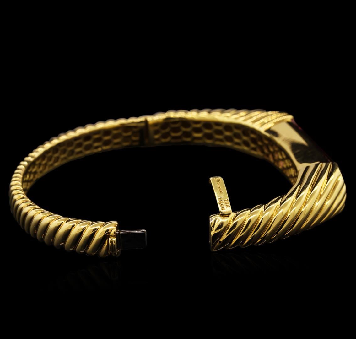 One electronically tested 18KT yellow gold lady's combination cast & assembled bangle bracelet with a tongue clasp with fold over safety with a bright polish finish. Trademark is Baca. Identified with markings of "18K". Condition is new, good workmanship. Containing: One channel set rectangular modified mixed cut natural bi-color tourmaline, measuring 33.00 x 9.20 x 6.40mm, 10% bulge factor, approximate weight of 19.46ct., clarity is eye clean, type II, very light, moderately strong, slightly yellowish green color, (GIA slyG 2/4), cut is excellent. Watermelon pink hue with moderate strong color saturation and medium Division of Color. Graded in the setting. Eight channel set princess cut diamonds, measuring 2.12 x 2.00 x 1.50mm (depth est.) approximate total weight of 8 Stones = 0.40ct. Graded in the setting. Clarity: VS-1 to VS-2. Color: F - G. Cut Very Good. Total Weight of Colored Stones 19.46ct. Total Weight of Diamonds 0.40ct. Total Weight of Bracelet 50.06gm. GAS Appraised at $10,460.00.
