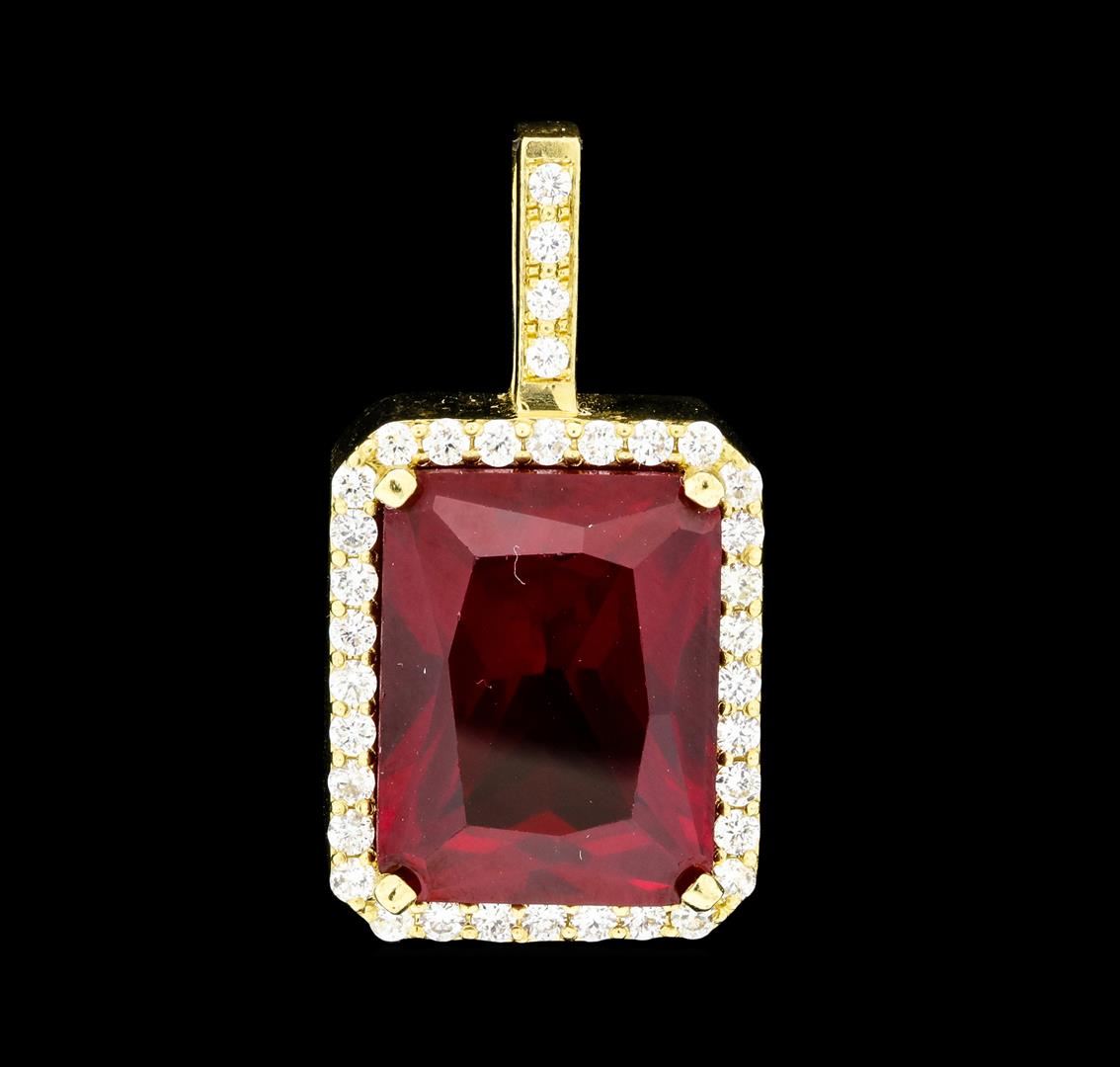 One electronically tested 14KT yellow gold lady's cast fashion pendant with a halo with a bright polish finish. Identified with markings of '14K'. Condition is used, good workmanship. Containing: One prong set radiant modified brilliant cut laboratory created ruby, measuring 17.15 x 13.15 x 8.31mm, (depth est.) approximate weight of 19.50ct., clarity is eye clean, medium dark, strong, red color, (GIA R 6/5), cut is very good. Transmitting light with no distortion, transparent. Colored gemstones are presumed to have been subjected to commonly used enhancement processes. Graded in the setting. Thirty-Six prong set round brilliant cut diamonds, measuring 1.80 - 1.70 x 1.09mm (depth est.) approximate total weight of 36 Stones = 0.75ct. Graded in the setting. Clarity SI-1 to I-1. Color: G - H Cut Good. Total Weight of Colored Stones 19.50ct.. Total Weight of Diamonds 0.75ct.. Total Weight of Pendant 11.20gm GAS Appraised at $2,545.00.