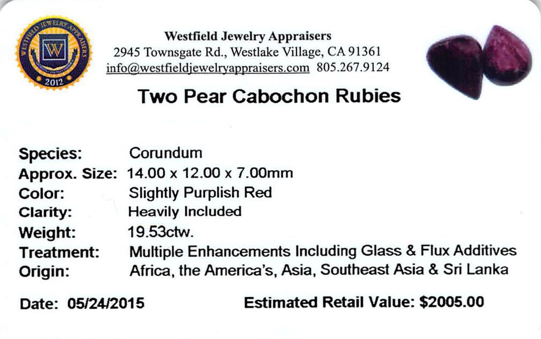 Two pear cabochon cut natural rubies, measuring 14.00 x 12.00 x 7.00mm, exact total weight 19.53ct., clarity is heavily included, type II, dark, very slightly brownish, slightly purplish red color, (GIA slpR 7/3), cut is good. Transmitting light diffusely, opaque. Naturally occurring internal & external characteristics are present. Indications of laboratory high temperature heat treatment, with glass & flux additives. Ruby has a low tolerance to rhodium plating, repolishing the surface, & ultrasonic cleaning. Westfield Appraised at $2,005.00.