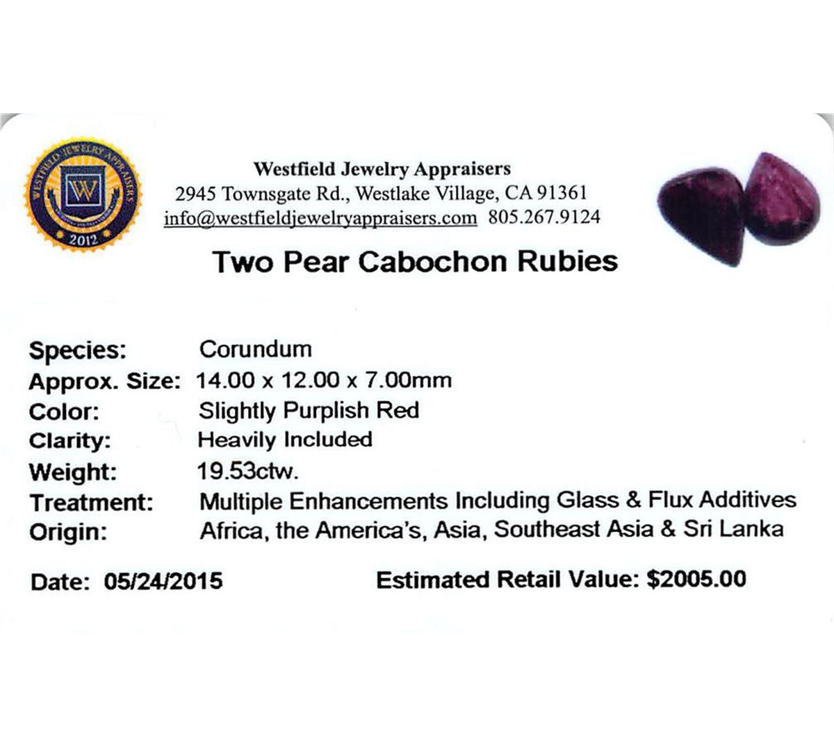 Two pear cabochon cut natural rubies, measuring 14.00 x 12.00 x 7.00mm, exact total weight 19.53ct., clarity is heavily included, type II, dark, very slightly brownish, slightly purplish red color, (GIA slpR 7/3), cut is good. Transmitting light diffusely, opaque. Naturally occurring internal & external characteristics are present. Indications of laboratory high temperature heat treatment, with glass & flux additives. Ruby has a low tolerance to rhodium plating, repolishing the surface, & ultrasonic cleaning. Westfield Appraised at $2,005.00.
