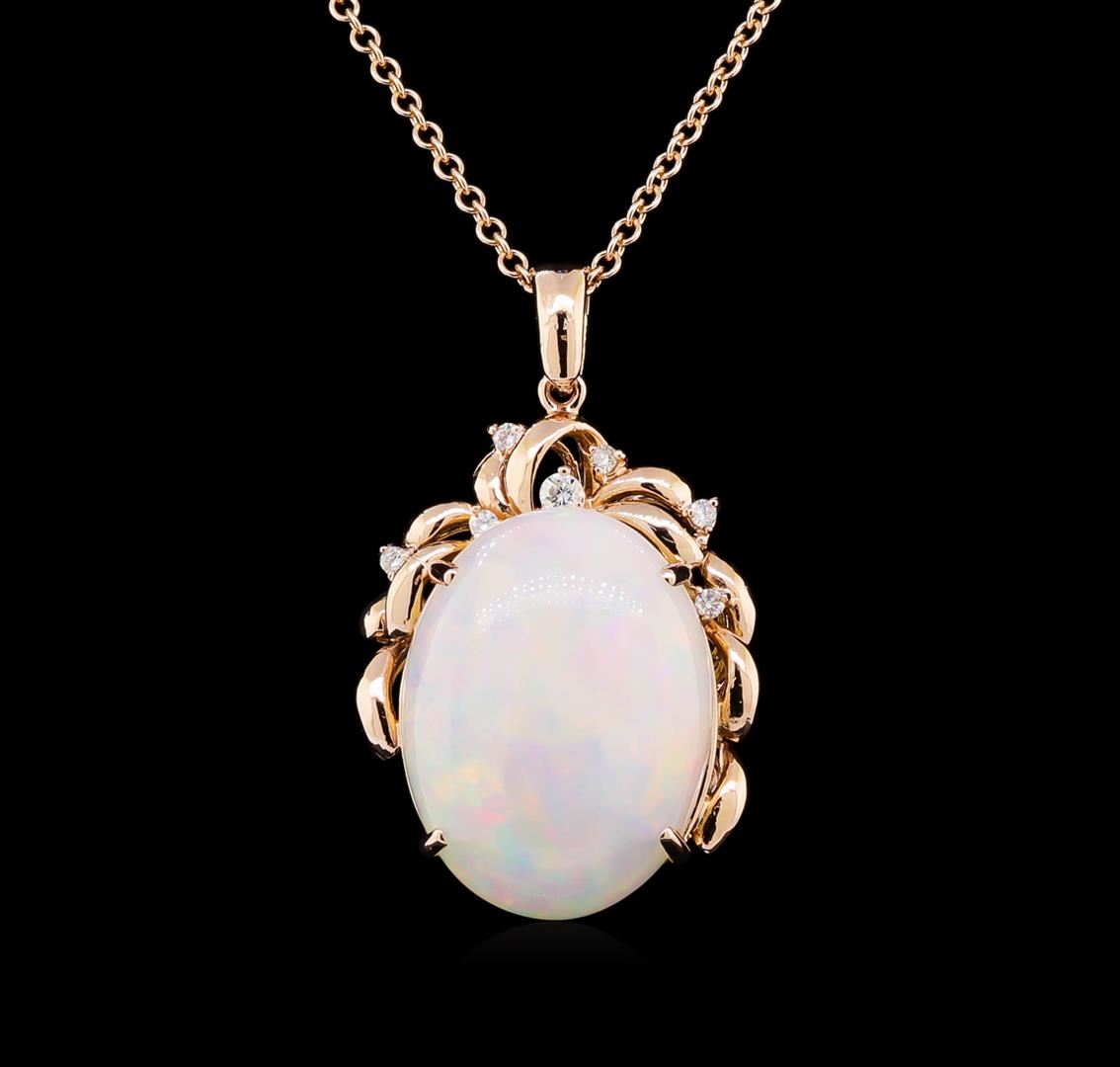 One electronically tested 14KT rose gold lady's combination cast & assembled fashion pendant & chain 20.0" long, 1.8mm round cable link with a lobster claw clasp with a bright polish finish. Identified with markings of "K14". Condition is new, good workmanship. Containing: Six prong set round brilliant cut diamonds, measuring 1.80 - 1.70 x 1.09mm (depth est.) approximate total weight of 6 Stones = 0.12ct. Graded in the setting. Clarity: SI-1 to SI-2. Color: H - I. Cut Good One prong set round brilliant cut diamond, measuring 2.60 - 2.50 x 1.53mm (depth est.) approximate weight of 0.06ct. Graded in the setting. Clarity: SI-1 to SI-2. Color: H - I. Cut Good One crystal opal that is cut in a oval shaped cabochon and is prong set, measuring 23.80 mm long x 17.90 mm wide, and 9.80 mm thick and the approximate weight is 19.56 carats. The opal has a somewhat bright, multicolor play of color (fire) in a rolling flashfire pattern; a medium dome; a good cut; no inclusions; consistent in its brightness and pattern; and is not directional. Graded in the setting. Total Weight of Diamonds 0.18ct. Total Weight of Opals 19.56ct. Total Weight of Pendant & Chain 13.40gm. GAS Appraised at $6,560.00.