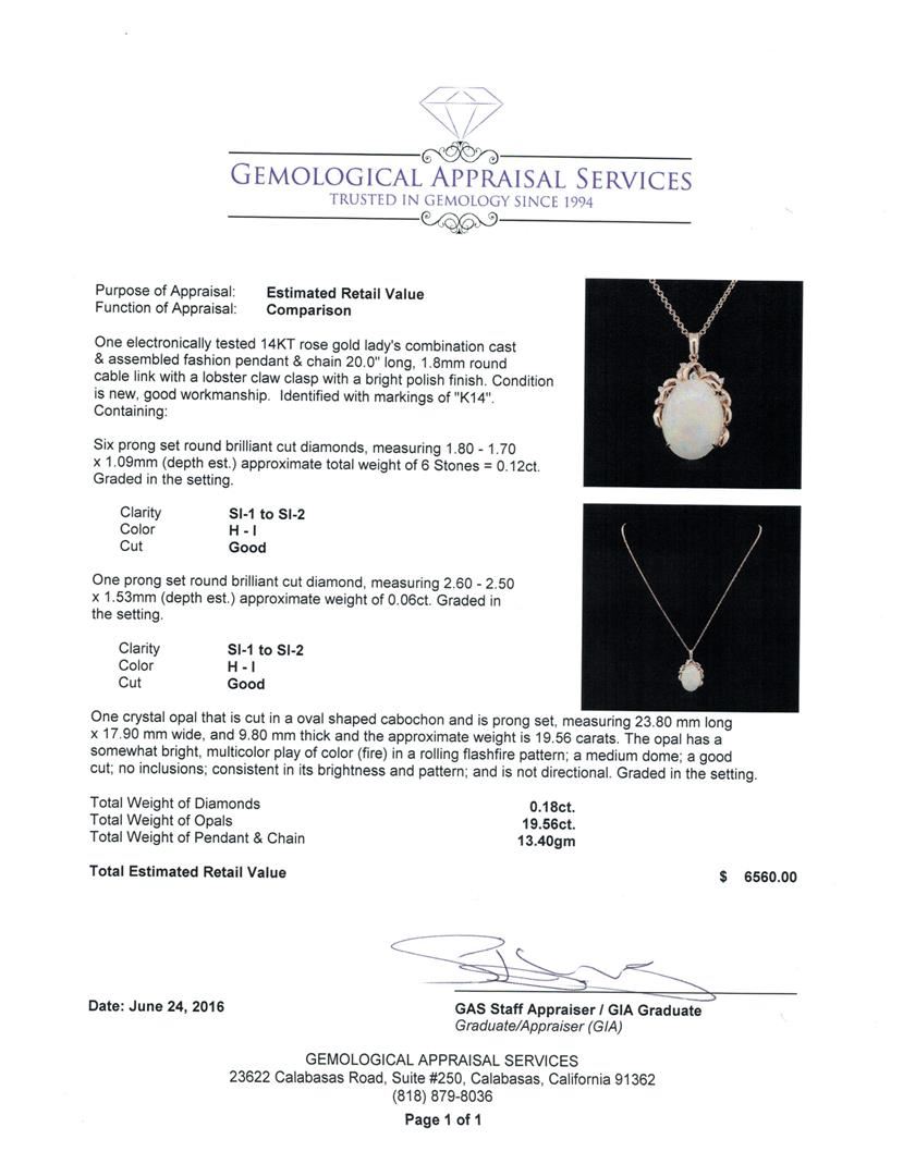 One electronically tested 14KT rose gold lady's combination cast & assembled fashion pendant & chain 20.0" long, 1.8mm round cable link with a lobster claw clasp with a bright polish finish. Identified with markings of "K14". Condition is new, good workmanship. Containing: Six prong set round brilliant cut diamonds, measuring 1.80 - 1.70 x 1.09mm (depth est.) approximate total weight of 6 Stones = 0.12ct. Graded in the setting. Clarity: SI-1 to SI-2. Color: H - I. Cut Good One prong set round brilliant cut diamond, measuring 2.60 - 2.50 x 1.53mm (depth est.) approximate weight of 0.06ct. Graded in the setting. Clarity: SI-1 to SI-2. Color: H - I. Cut Good One crystal opal that is cut in a oval shaped cabochon and is prong set, measuring 23.80 mm long x 17.90 mm wide, and 9.80 mm thick and the approximate weight is 19.56 carats. The opal has a somewhat bright, multicolor play of color (fire) in a rolling flashfire pattern; a medium dome; a good cut; no inclusions; consistent in its brightness and pattern; and is not directional. Graded in the setting. Total Weight of Diamonds 0.18ct. Total Weight of Opals 19.56ct. Total Weight of Pendant & Chain 13.40gm. GAS Appraised at $6,560.00.