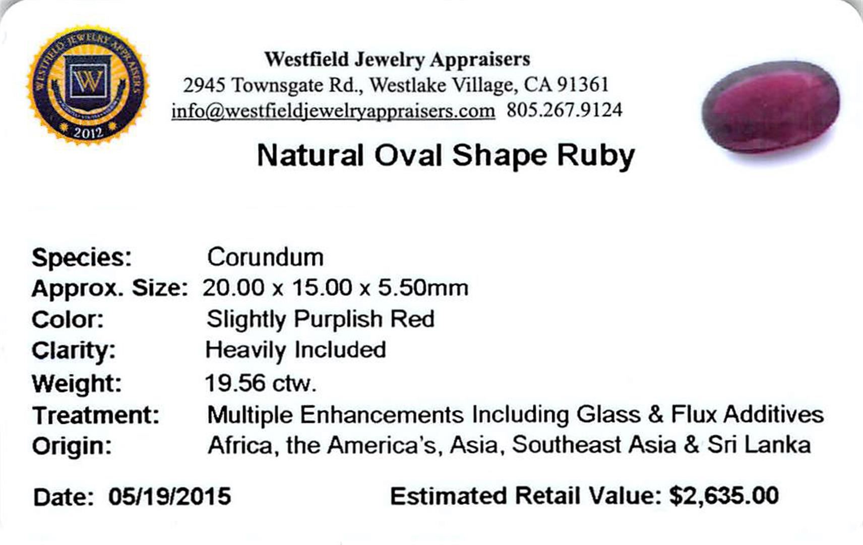 One oval mixed cut natural ruby, measuring 20.00 x 15.00 x 5.50mm, exact weight 19.56ct., clarity is heavily included, type II, dark, very slightly brownish, slightly purplish red color, (GIA slpR 7/3), cut is good. Transmitting light somewhat diffusely, transparent to translucent. Naturally occurring internal & external characteristics are present. Indications of laboratory high temperature heat treatment, with glass & flux additives. Ruby has a low tolerance to rhodium plating, repolishing the surface, & ultrasonic cleaning. Westfield Appraised at $2,635.00.