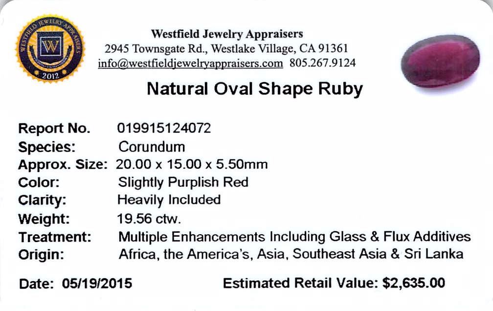 One oval mixed cut natural ruby, measuring 20.00 x 15.00 x 5.50mm, exact weight 19.56ct., clarity is heavily included, type II, dark, very slightly brownish, slightly purplish red color, (GIA slpR 7/3), cut is good. Transmitting light somewhat diffusely, transparent to translucent. Naturally occurring internal & external characteristics are present. Indications of laboratory high temperature heat treatment, with glass & flux additives. Ruby has a low tolerance to rhodium plating, repolishing the surface, & ultrasonic cleaning. Westfield Appraised at $2,635.00.