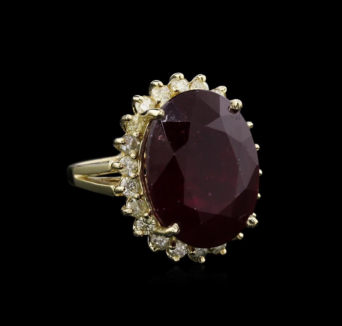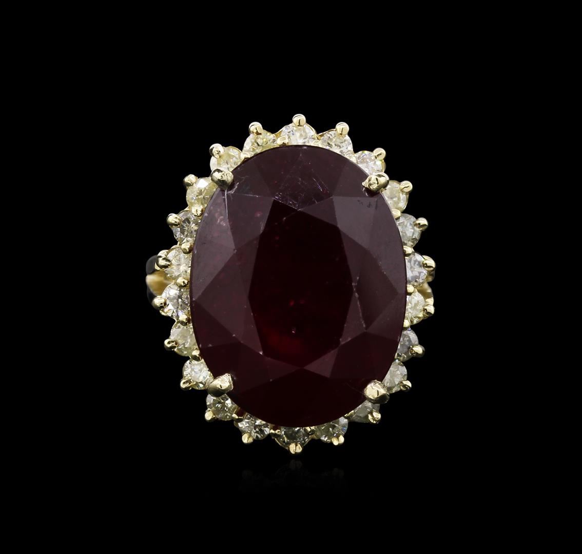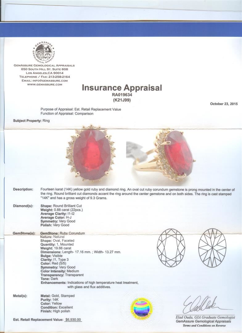 Fourteen karat (14K) yellow gold ruby and diamond ring. An oval cut ruby corundum gemstone is prong mounted in the center of the ring. Round brilliant cut diamonds accent the ring around the center gemstone and on both sides. The ring is cast stamped "14K" and has a gross weight of 9.3 Grams. Diamond(s): Shape: Round Brilliant Cut. Weight: 0.88 carat (22pcs). Average Clarity: I1-I2. Average Color: H-J. Symmetry: Very Good. Polish: Very Good. GemStone(s): Ruby Corundum. Nature: Natural. Shape: Oval, Faceted. Quantity: 1, Mounted. Weight: 19.66 carat. Dimensions: Length- 17.16 mm. ; Width 13.27mm. Bulge: Visible. Clarity: I1, Type 3. Color: Red (5/5). Symmetry: Very Good. Color Intensity: Medium. Transparency: Transparent. Tone: Dark. Enhancements: Indications of high temperature heat treatment, with glass and flux additives. Metal(s): Metal: Gold, Stamped. Purity: 14K. Color: Yellow. Condition: Excellent. Finish: High polish. GGA Appraised at $6,930.00.