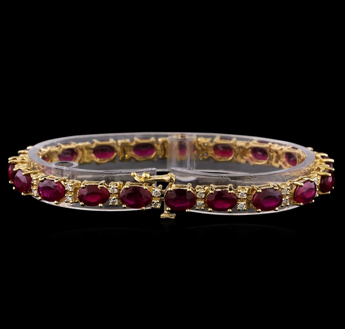 One electronically tested 14KT yellow gold lady's combination cast & assembled fashion bracelet with a tongue clasp with foldover safety with a straight line with a bright polish finish. The featured lady's bracelet measures 7 inches in length. Identified with markings of "14K". Condition is new, good workmanship. Containing: Nineteen prong set oval modified brilliant cut natural rubies, measuring 6.93 x 5.08 x 3.50mm, (depth est.) approximate total weight of 19.68ct., clarity is moderately included, medium, moderately strong, red color, (GIA R 5/4), cut is good. Transmitting light somewhat diffusely, transparent to translucent. Colored gemstones are presumed to have been subjected to commonly used enhancement processes. Graded in the setting. Thirty-Eight prong set round brilliant cut diamonds, measuring 1.90 - 1.80 x 1.13mm (depth est.) approximate total weight of 38 Stones = 0.85ct. Graded in the setting. Clarity: SI-1 to SI-2. Color: H - I. Cut Good. Total Weight of Colored Stones 19.68ct. Total Weight of Diamonds 0.85ct. Total Weight of Bracelet 19.50gm. GAS Appraised at $8,865.00.