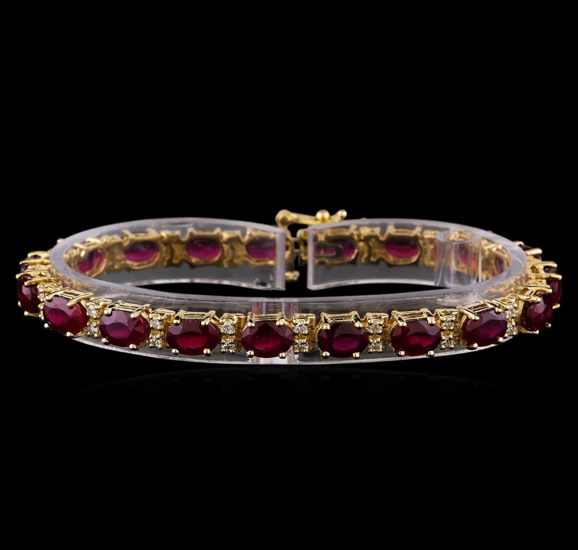 One electronically tested 14KT yellow gold lady's combination cast & assembled fashion bracelet with a tongue clasp with foldover safety with a straight line with a bright polish finish. The featured lady's bracelet measures 7 inches in length. Identified with markings of "14K". Condition is new, good workmanship. Containing: Nineteen prong set oval modified brilliant cut natural rubies, measuring 6.93 x 5.08 x 3.50mm, (depth est.) approximate total weight of 19.68ct., clarity is moderately included, medium, moderately strong, red color, (GIA R 5/4), cut is good. Transmitting light somewhat diffusely, transparent to translucent. Colored gemstones are presumed to have been subjected to commonly used enhancement processes. Graded in the setting. Thirty-Eight prong set round brilliant cut diamonds, measuring 1.90 - 1.80 x 1.13mm (depth est.) approximate total weight of 38 Stones = 0.85ct. Graded in the setting. Clarity: SI-1 to SI-2. Color: H - I. Cut Good. Total Weight of Colored Stones 19.68ct. Total Weight of Diamonds 0.85ct. Total Weight of Bracelet 19.50gm. GAS Appraised at $8,865.00.