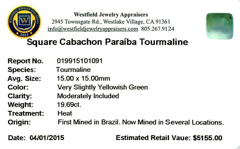 One rectangular cabochon cut natural Paraiba tourmaline exact weight 19.69ct., clarity is moderately included, cut is good. Westfield Appraised at $5,155.00.