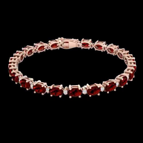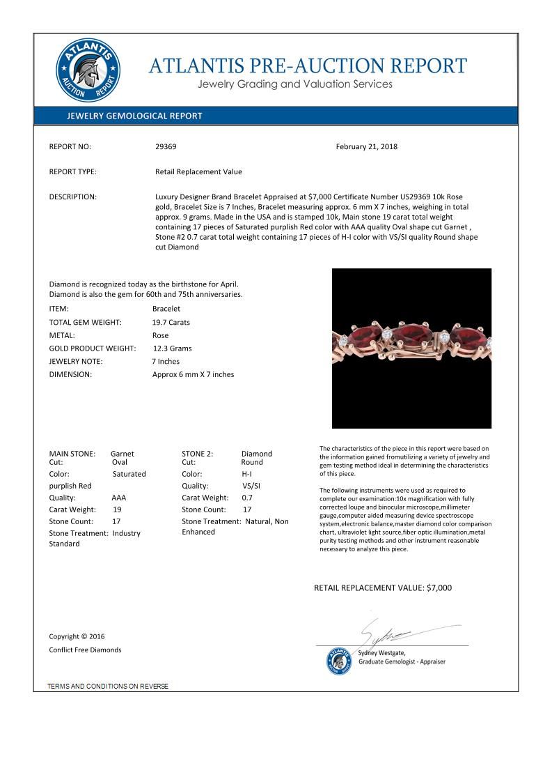 REF-98W2F -29369 ---- 19.7 CTW Garnet & VS/SI Certified Diamond Eternity Bracelet 10K Rose Gold ---- Luxury Designer Brand Bracelet Appraised at $7,000 Certificate Number US29369 10k Rose gold, Bracelet Size is 7 Inches, Bracelet measuring approx. 6 mm X 7 inches, weighing in total approx. 9 grams. Made in the USA and is stamped 10k, Main stone 19 carat total weight containing 17 pieces of Saturated purplish Red color with AAA quality Oval shape cut Garnet , Stone #2 0.7 carat total weight containing 17 pieces of H-I color with VS/SI quality Round shape cut Diamond