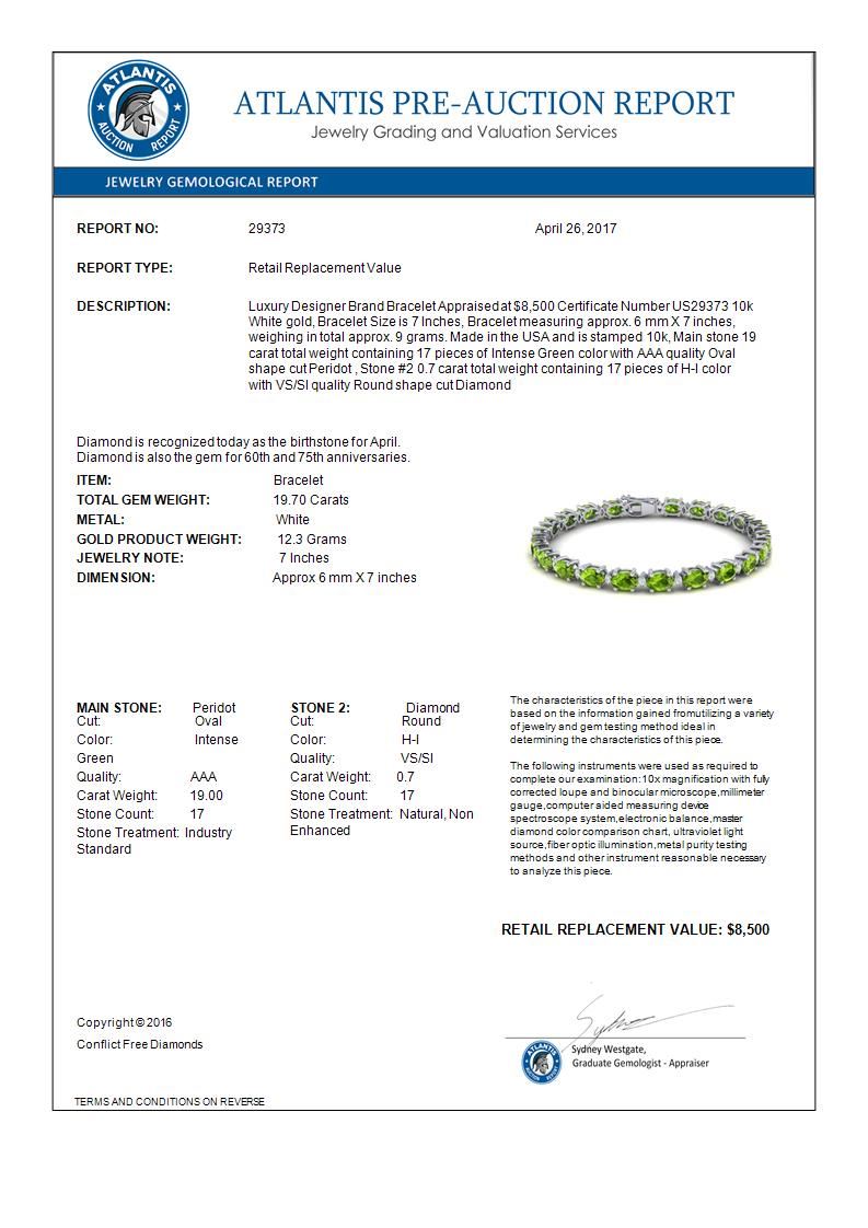19.7 CTW Peridot & VS/SI Certified Diamond Eternity Bracelet 10K White Gold ---- Luxury Designer Brand Bracelet Appraised Retail Price at $8,500 ---- SKU Number US29373 10k White gold Bracelet Size is 7 Inches, Bracelet measuring approx. 6 mm X 7 inches, weighing in total approx. 9 grams. Made in the USA and is stamped 10k, Main stone 19.00 carat total weight containing 17 pieces of Intense Green color with AAA quality Oval shape cut Peridot , Stone #2 0.7 carat total weight containing 17 pieces of H-I color with VS/SI quality Round shape cut