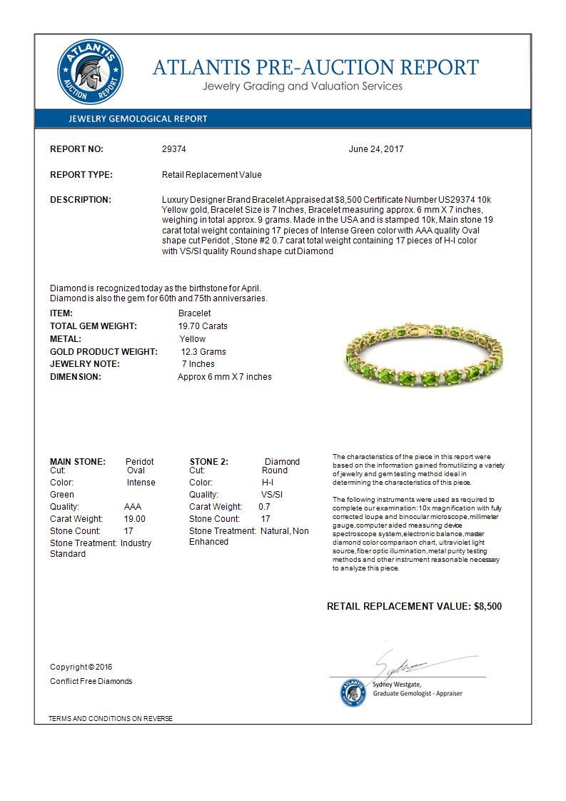 19.7 CTW Peridot & VS/SI Certified Diamond Eternity Bracelet 10K Yellow Gold ---- Luxury Designer Brand Bracelet Appraised Retail Price at $8,500 ---- SKU Number US29374 10k Yellow gold Bracelet Size is 7 Inches, Bracelet measuring approx. 6 mm X 7 inches, weighing in total approx. 9 grams. Made in the USA and is stamped 10k, Main stone 19.00 carat total weight containing 17 pieces of Intense Green color with AAA quality Oval shape cut Peridot , Stone #2 0.7 carat total weight containing 17 pieces of H-I color with VS/SI quality Round shape cut