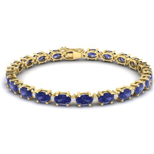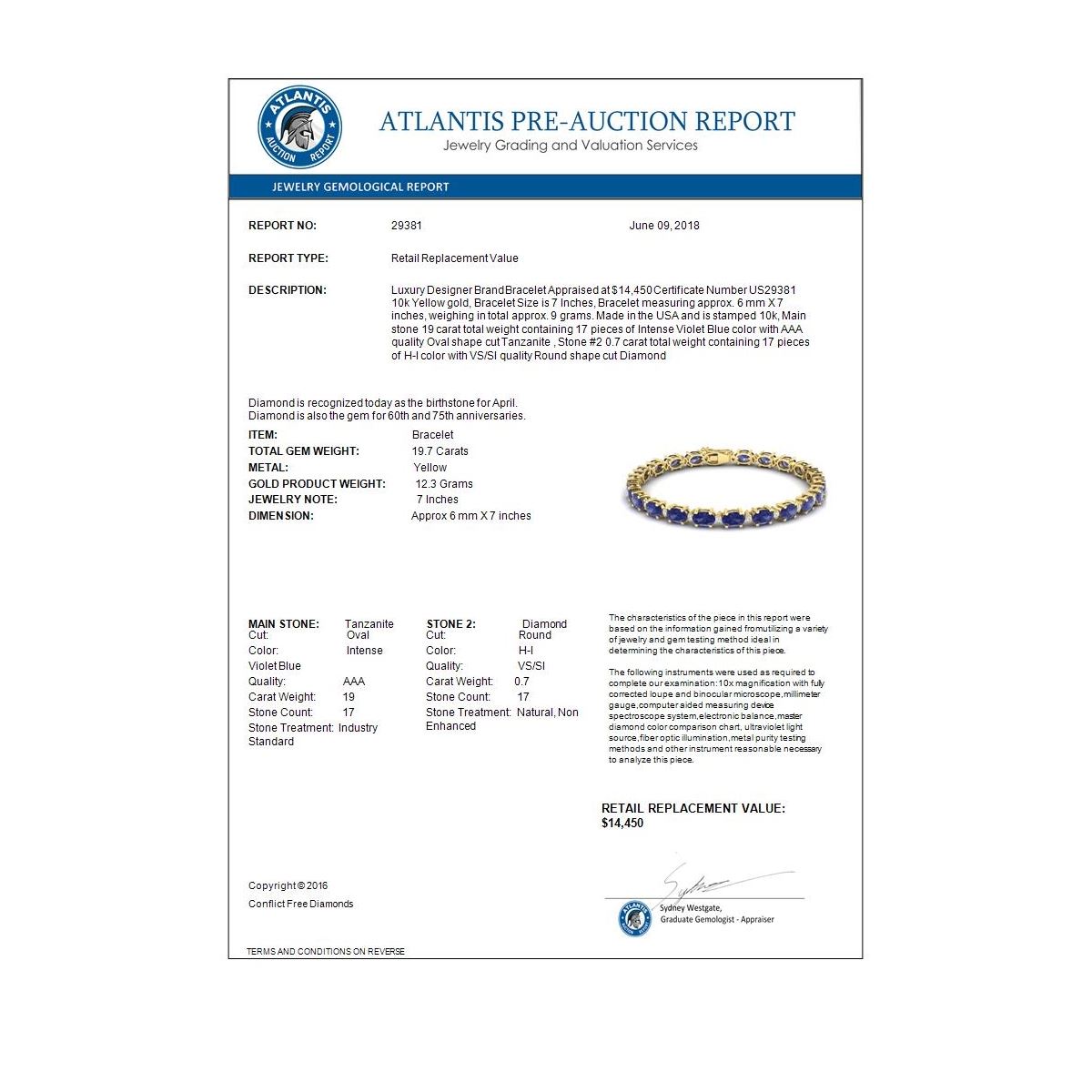 REF-187X6T -29381 ---- 19.7 CTW Tanzanite & VS/SI Certified Diamond Eternity Bracelet 10K Yellow Gold ---- Luxury Designer Brand Bracelet Appraised at $14,450 Certificate Number US29381 10k Yellow gold, Bracelet Size is 7 Inches, Bracelet measuring approx. 6 mm X 7 inches, weighing in total approx. 9 grams. Made in the USA and is stamped 10k, Main stone 19 carat total weight containing 17 pieces of Intense Violet Blue color with AAA quality Oval shape cut Tanzanite , Stone #2 0.7 carat total weight containing 17 pieces of H-I color with VS/SI quality Round shape cut Diamond