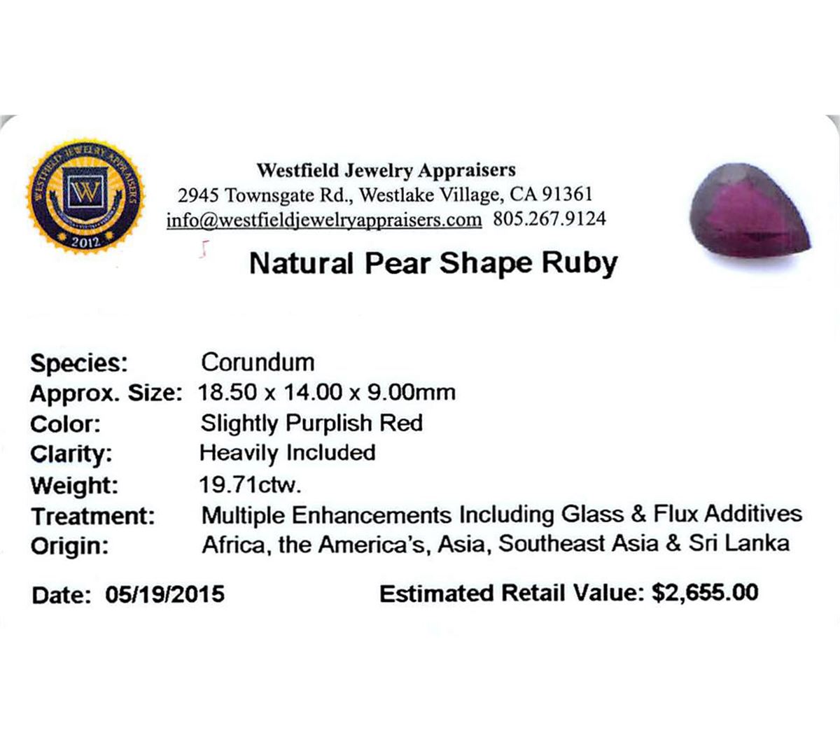 One pear mixed cut natural ruby, measuring 18.50 x 14.00 x 9.00mm, exact weight 19.71ct., clarity is heavily included, type II, dark, very slightly brownish, slightly purplish red color, (GIA slpR 7/3), cut is good. Transmitting light somewhat diffusely, transparent to translucent. Naturally occurring internal & external characteristics are present. Indications of laboratory high temperature heat treatment, with glass & flux additives. Ruby has a low tolerance to rhodium plating, repolishing the surface, & ultrasonic cleaning. Westfield Appraised at $2,655.00.