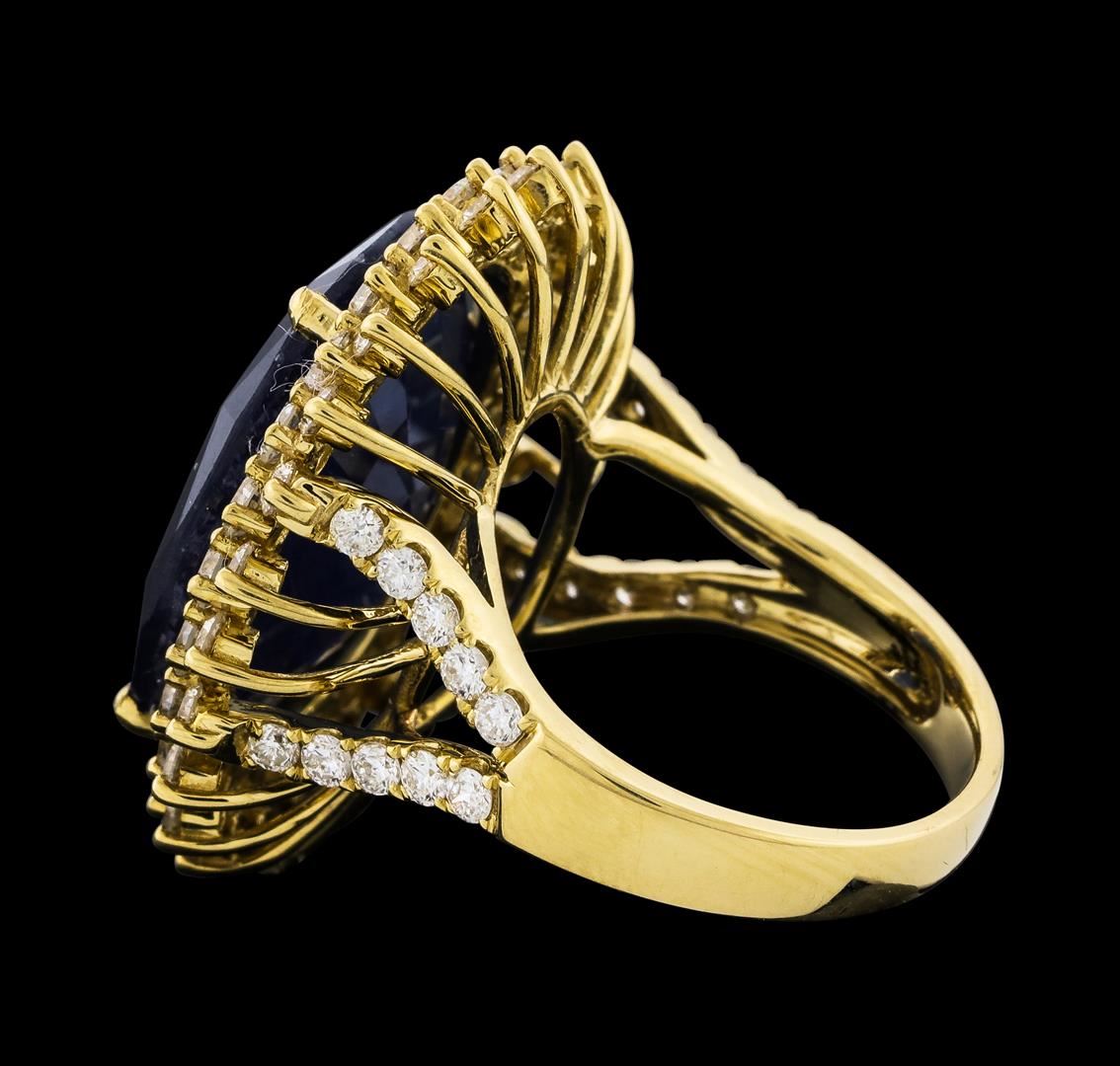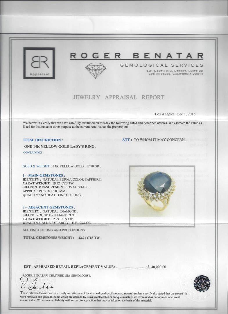 One 14KT yellow gold lady's ring, containing: 14KT yellow gold, 12.70 gr. Main gemstone: Identity: Burma color sapphire. Carat weight: 19.72 cts tw. Shape and measurement: oval shape. Approx.: 19.85 x 16.83 mm. Quality: no heat. Fine cutting. Adjacent gemstones: Identity: Natural Diamond. Shape: round brilliant cut. Carat weight: 2.99 cts tw. Quality: all VS clarity, E-F color. All fine cutting and proportions. Total gemstones weight: 22.71ct. RBGS Appraised at $40,000.00.