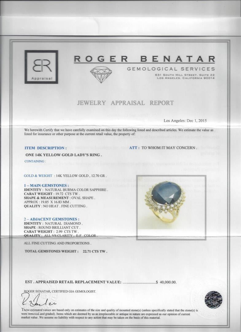 One 14KT yellow gold lady's ring, containing: 14KT yellow gold, 12.70 gr. Main gemstone: Identity: Burma color sapphire. Carat weight: 19.72 cts tw. Shape and measurement: oval shape. Approx.: 19.85 x 16.83 mm. Quality: no heat. Fine cutting. Adjacent gemstones: Identity: Natural Diamond. Shape: round brilliant cut. Carat weight: 2.99 cts tw. Quality: all VS clarity, E-F color. All fine cutting and proportions. Total gemstones weight: 22.71ct.