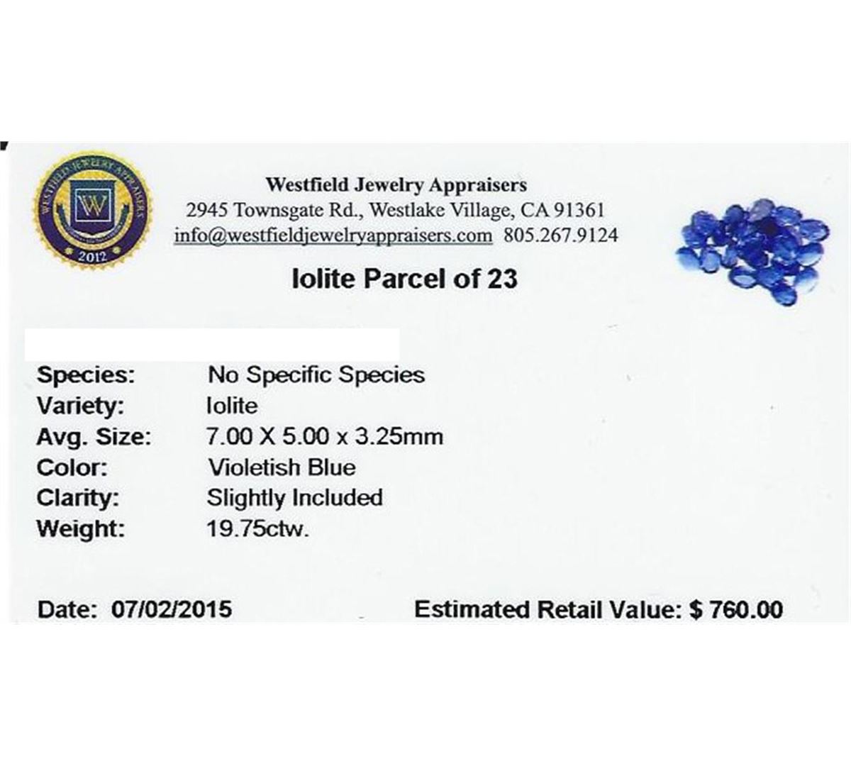 Twenty-three oval mixed cut natural iolites, measuring 7.00 x 5.00 x 3.25mm, exact total weight 19.75ct., clarity is slightly included, type II, medium dark, slightly grayish, violetish blue color, (GIA vB 6/2), cut is good. Measurements & the color grade are an average for the group, Transmitting light very diffusely, translucent to opaque, Naturally occurring internal & external characteristics are present, Indications of laboratory high temperature heat treatment. Westfield Appraised at $760.00.