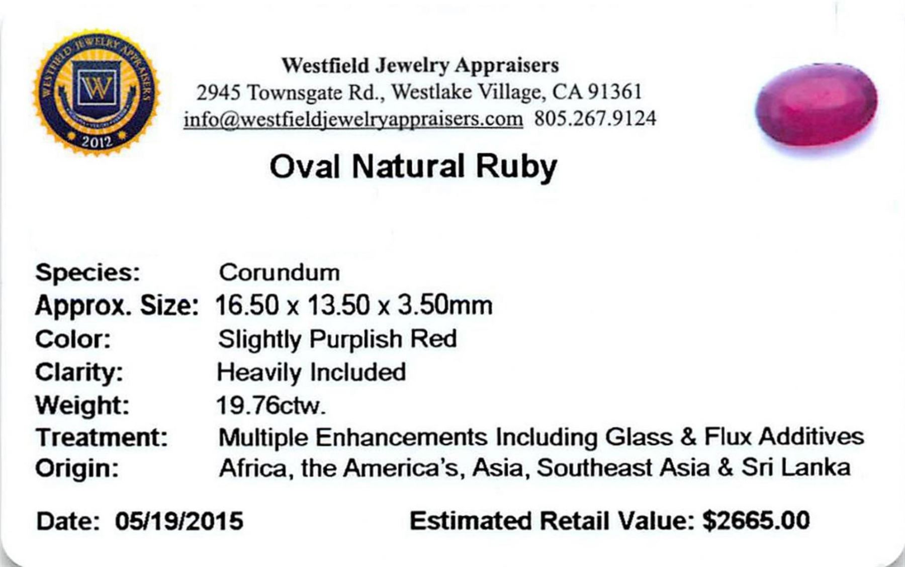 One oval mixed cut natural ruby, measuring 17.00 x 15.05 x 7.50mm, exact weight 19.76ct., clarity is heavily included, type II, dark, very slightly brownish, slightly purplish red color, (GIA slpR 7/3), cut is good. Transmitting light somewhat diffusely, transparent to translucent. Naturally occurring internal & external characteristics are present. Indications of laboratory high temperature heat treatment, with glass & flux additives. Ruby has a low tolerance to rhodium plating, repolishing the surface, & ultrasonic cleaning._x000D_ Westfield Appraised.