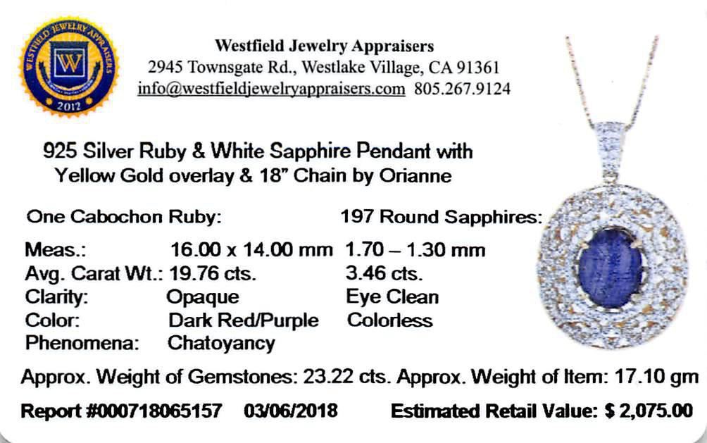 Electronically tested 925 silver ladies cast & assembled ruby and sapphire pendant with gold overlay. 18" length. Trademark is Orianne. Identified with markings of "925". Condition is new, good workmanship. Containing: One prong set oval cabochon cut nat
