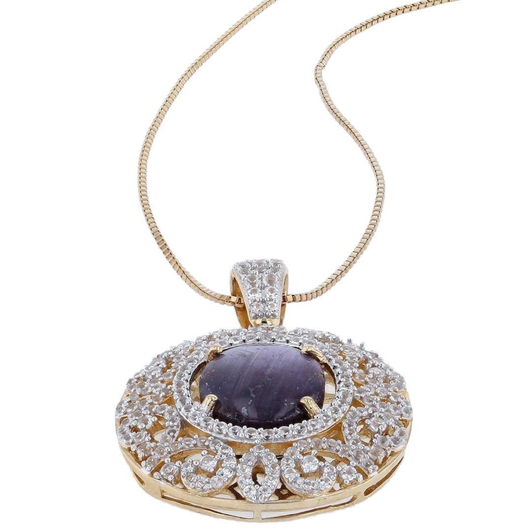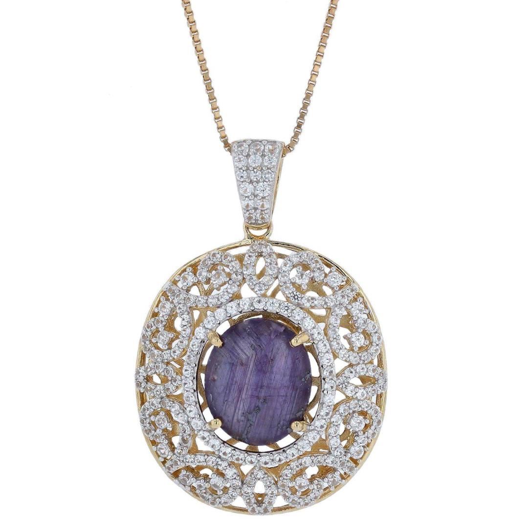 Electronically tested 925 silver ladies cast & assembled ruby and sapphire pendant with gold overlay. 18" length. Trademark is Orianne. Identified with markings of "925". Condition is new, good workmanship. Containing: One prong set oval cabochon cut nat