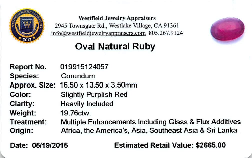One oval mixed cut natural ruby, measuring 17.00 x 15.05 x 7.50mm, exact weight 19.76ct., clarity is heavily included, type II, dark, very slightly brownish, slightly purplish red color, (GIA slpR 7/3), cut is good. Transmitting light somewhat diffusely, transparent to translucent. Naturally occurring internal & external characteristics are present. Indications of laboratory high temperature heat treatment, with glass & flux additives. Ruby has a low tolerance to rhodium plating, repolishing the surface, & ultrasonic cleaning. Westfield Appraised at $2,665.00.