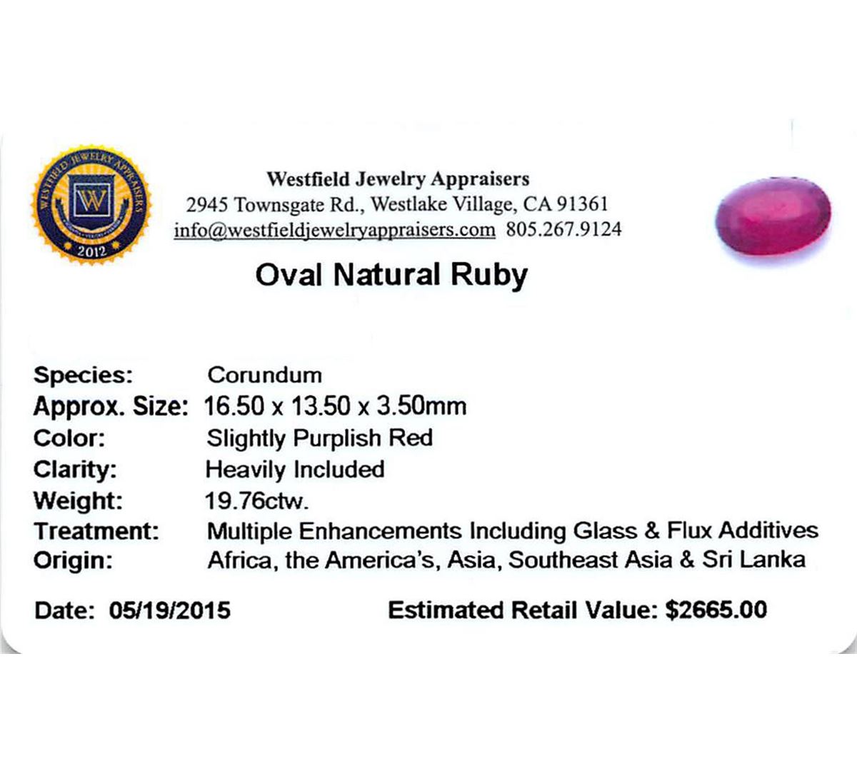 One oval mixed cut natural ruby, measuring 17.00 x 15.05 x 7.50mm, exact weight 19.76ct., clarity is heavily included, type II, dark, very slightly brownish, slightly purplish red color, (GIA slpR 7/3), cut is good. Transmitting light somewhat diffusely, transparent to translucent. Naturally occurring internal & external characteristics are present. Indications of laboratory high temperature heat treatment, with glass & flux additives. Ruby has a low tolerance to rhodium plating, repolishing the surface, & ultrasonic cleaning. Westfield Appraised at $2,665.00.