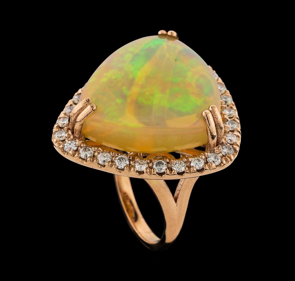 One electronically tested 14KT rose gold lady's cast fashion ring with a split shank halo with a bright polish finish. The featured lady's ring has a shank measuring 2.13 millimeters wide. Identified with markings of '14K'. Condition is new, good workmanship. Containing: One orange crystal that is cut in a triangle shaped cabochon and is prong set, measuring 21.20 mm long x 19.50 mm wide, and 10.09 mm thick and the approximate weight is 19.78 carats. The opal has a somewhat bright, orange-red play of color (fire) in a rolling flashfire pattern; a medium dome; a good cut; no inclusions; consistent in its brightness and pattern; and is not directional. Graded in the setting. Twenty-Nine prong set round brilliant cut diamonds, measuring 2.10 - 2.00 x 1.27mm (depth est.) approximate total weight of 29 Stones = 0.96ct. Graded in the setting. Clarity SI-1 to SI-2. Color: H - I Cut Good. Total Weight of Diamonds 0.96ct.. Total Weight of Opals 19.78ct.. Total Weight of Ring 14.00gm. GAS Appraised at $9,215.00.