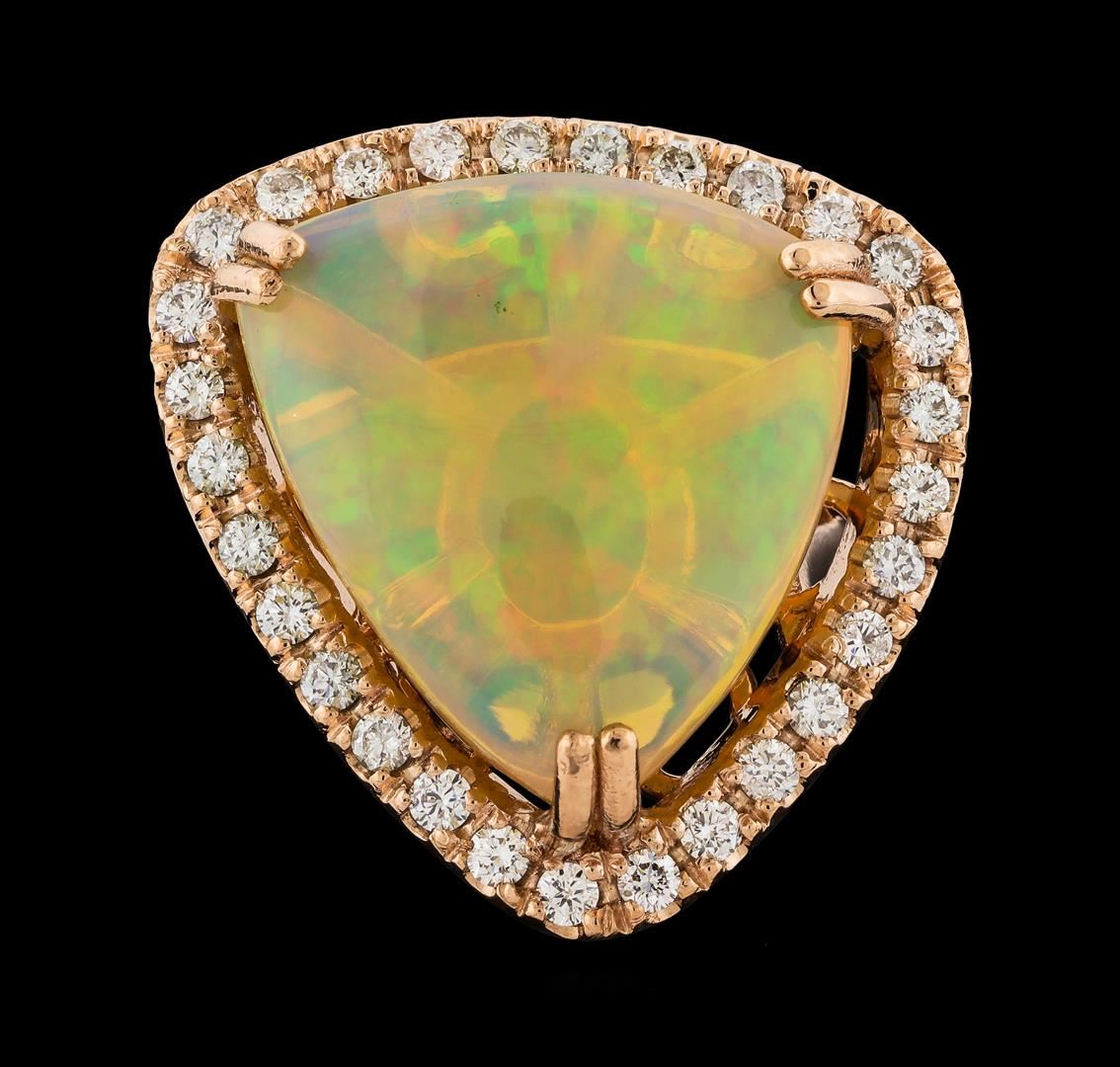 One electronically tested 14KT rose gold lady's cast fashion ring with a split shank halo with a bright polish finish. The featured lady's ring has a shank measuring 2.13 millimeters wide. Identified with markings of '14K'. Condition is new, good workmanship. Containing: One orange crystal that is cut in a triangle shaped cabochon and is prong set, measuring 21.20 mm long x 19.50 mm wide, and 10.09 mm thick and the approximate weight is 19.78 carats. The opal has a somewhat bright, orange-red play of color (fire) in a rolling flashfire pattern; a medium dome; a good cut; no inclusions; consistent in its brightness and pattern; and is not directional. Graded in the setting. Twenty-Nine prong set round brilliant cut diamonds, measuring 2.10 - 2.00 x 1.27mm (depth est.) approximate total weight of 29 Stones = 0.96ct. Graded in the setting. Clarity SI-1 to SI-2. Color: H - I Cut Good. Total Weight of Diamonds 0.96ct.. Total Weight of Opals 19.78ct.. Total Weight of Ring 14.00gm. GAS Appraised at $9,215.00.