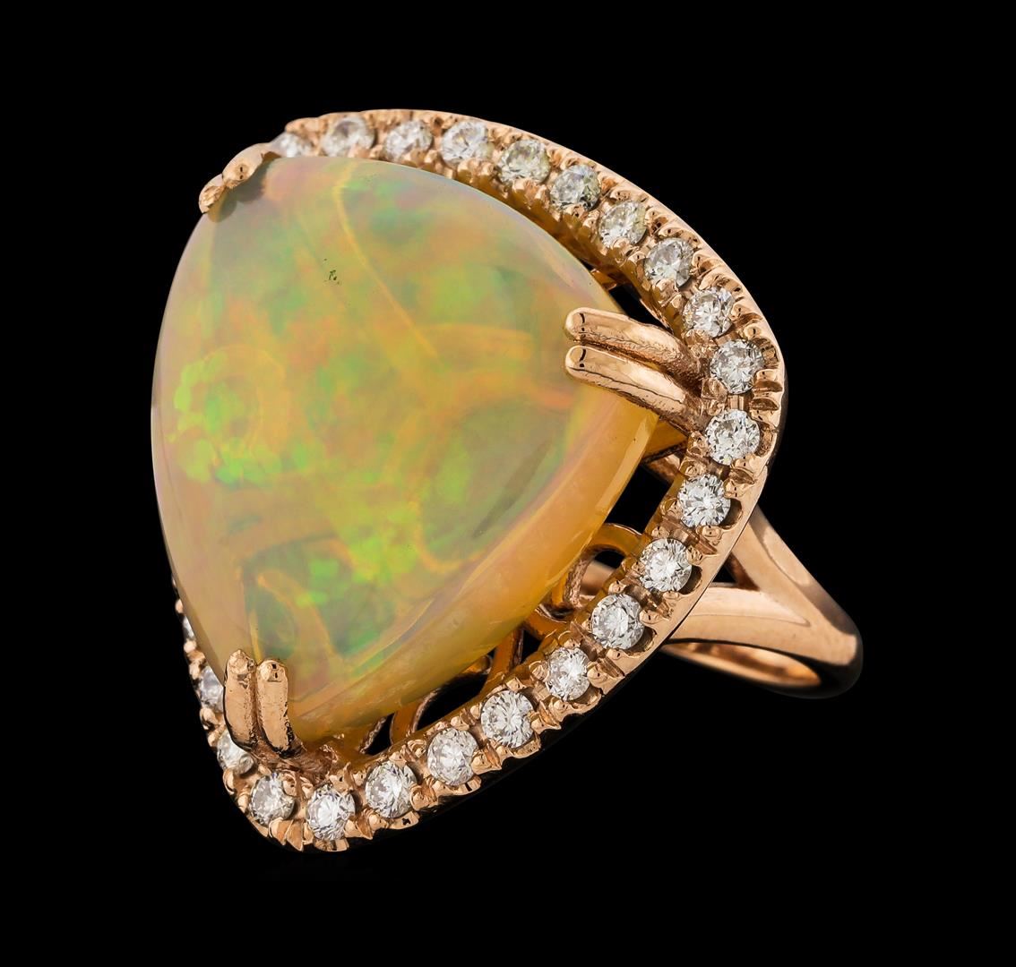 One electronically tested 14KT rose gold lady's cast fashion ring with a split shank halo with a bright polish finish. The featured lady's ring has a shank measuring 2.13 millimeters wide. Identified with markings of '14K'. Condition is new, good workmanship. Containing: One orange crystal that is cut in a triangle shaped cabochon and is prong set, measuring 21.20 mm long x 19.50 mm wide, and 10.09 mm thick and the approximate weight is 19.78 carats. The opal has a somewhat bright, orange-red play of color (fire) in a rolling flashfire pattern; a medium dome; a good cut; no inclusions; consistent in its brightness and pattern; and is not directional. Graded in the setting. Twenty-Nine prong set round brilliant cut diamonds, measuring 2.10 - 2.00 x 1.27mm (depth est.) approximate total weight of 29 Stones = 0.96ct. Graded in the setting. Clarity SI-1 to SI-2. Color: H - I Cut Good. Total Weight of Diamonds 0.96ct.. Total Weight of Opals 19.78ct.. Total Weight of Ring 14.00gm. GAS Appraised at $9,215.00.