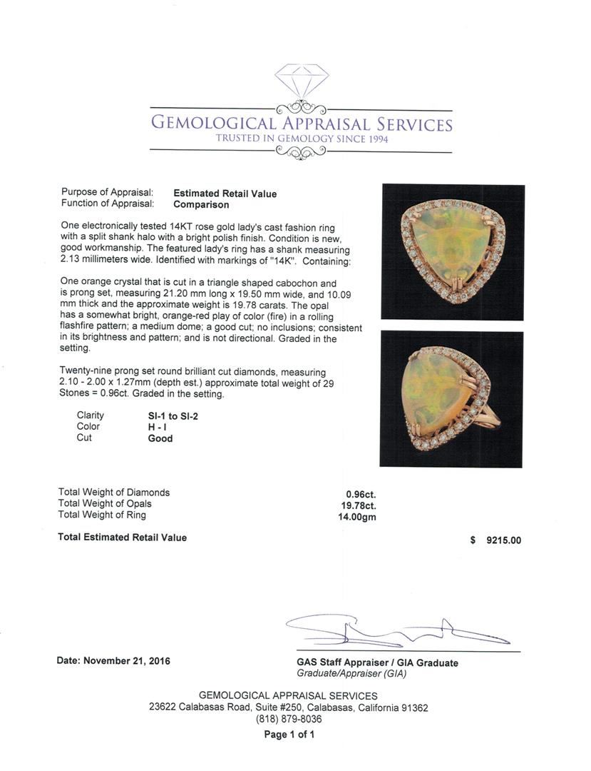 One electronically tested 14KT rose gold lady's cast fashion ring with a split shank halo with a bright polish finish. The featured lady's ring has a shank measuring 2.13 millimeters wide. Identified with markings of '14K'. Condition is new, good workmanship. Containing: One orange crystal that is cut in a triangle shaped cabochon and is prong set, measuring 21.20 mm long x 19.50 mm wide, and 10.09 mm thick and the approximate weight is 19.78 carats. The opal has a somewhat bright, orange-red play of color (fire) in a rolling flashfire pattern; a medium dome; a good cut; no inclusions; consistent in its brightness and pattern; and is not directional. Graded in the setting. Twenty-Nine prong set round brilliant cut diamonds, measuring 2.10 - 2.00 x 1.27mm (depth est.) approximate total weight of 29 Stones = 0.96ct. Graded in the setting. Clarity SI-1 to SI-2. Color: H - I Cut Good. Total Weight of Diamonds 0.96ct.. Total Weight of Opals 19.78ct.. Total Weight of Ring 14.00gm. GAS Appraised at $9,215.00.