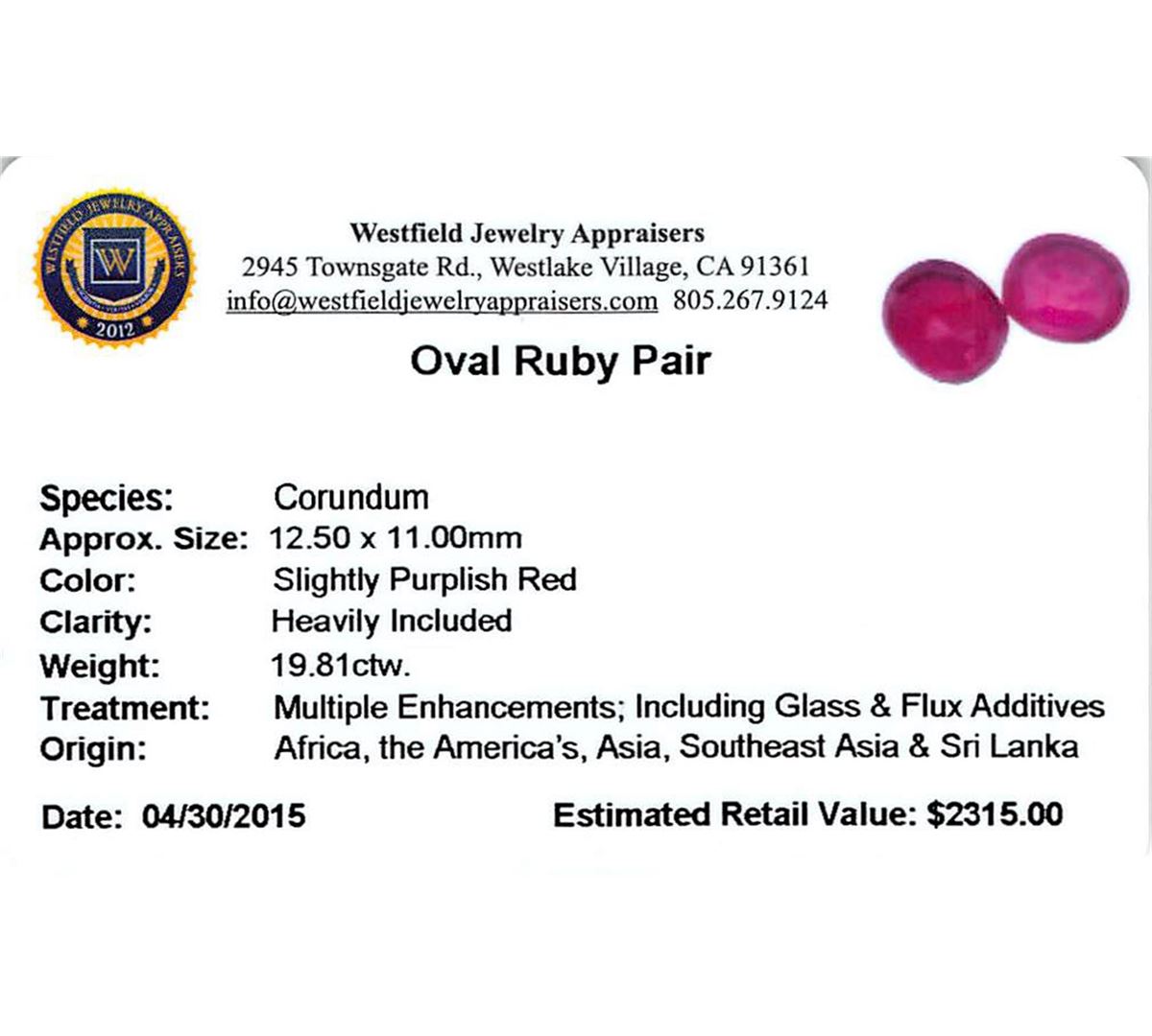 Two oval mixed cut natural rubies, measuring 12.50 x 11.00 x 6.00mm, exact total weight 19.81ct., clarity is heavily included, type II, dark, very slightly brownish, slightly purplish red color, (GIA slpR 7/3), cut is good. Transmitting light somewhat diffusely, translucent. Naturally occurring internal & external characteristics are present. Indications of laboratory high temperature heat treatment, with glass & flux additives. Ruby has a low tolerance to rhodium plating, repolishing the surface, & ultrasonic cleaning. Westfield Appraised at $2,315.00.