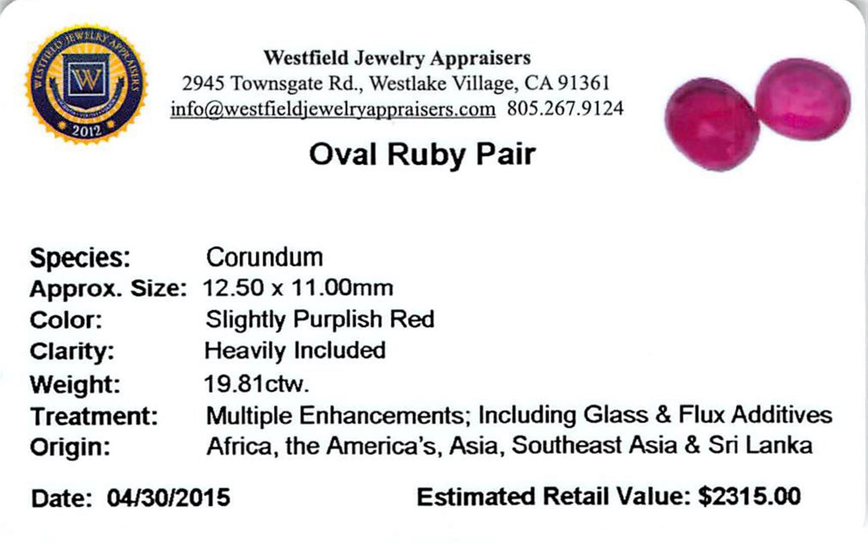 Two oval mixed cut natural rubies, measuring 12.50 x 11.00 x 6.00mm, exact total weight 19.81ct., clarity is heavily included, type II, dark, very slightly brownish, slightly purplish red color, (GIA slpR 7/3), cut is good. Transmitting light somewhat diffusely, translucent. Naturally occurring internal & external characteristics are present. Indications of laboratory high temperature heat treatment, with glass & flux additives. Ruby has a low tolerance to rhodium plating, repolishing the surface, & ultrasonic cleaning. Westfield Appraised at $2,315.00.