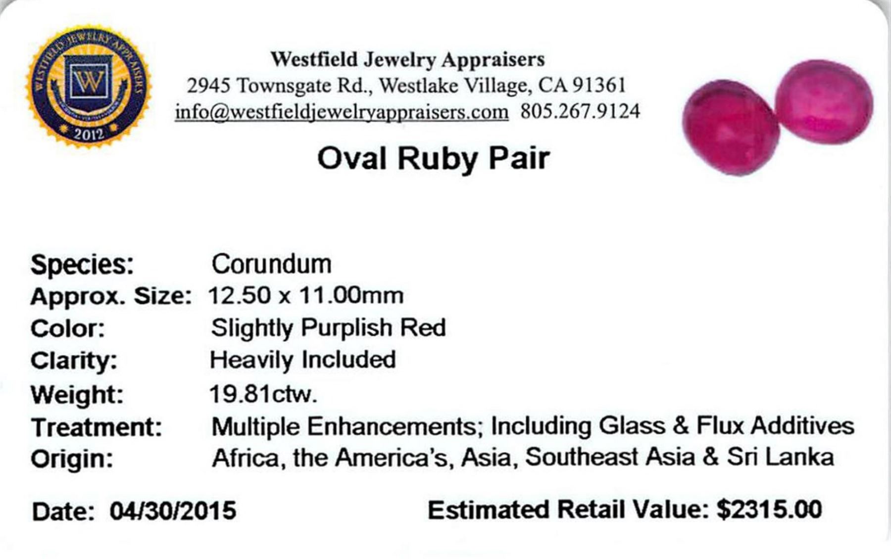 Two oval mixed cut natural rubies, measuring 12.50 x 11.00 x 6.00mm, exact total weight 19.81ct., clarity is heavily included, type II, dark, very slightly brownish, slightly purplish red color, (GIA slpR 7/3), cut is good. Transmitting light somewhat diffusely, translucent. Naturally occurring internal & external characteristics are present. Indications of laboratory high temperature heat treatment, with glass & flux additives. Ruby has a low tolerance to rhodium plating, repolishing the surface, & ultrasonic cleaning. Westfield Appraised.